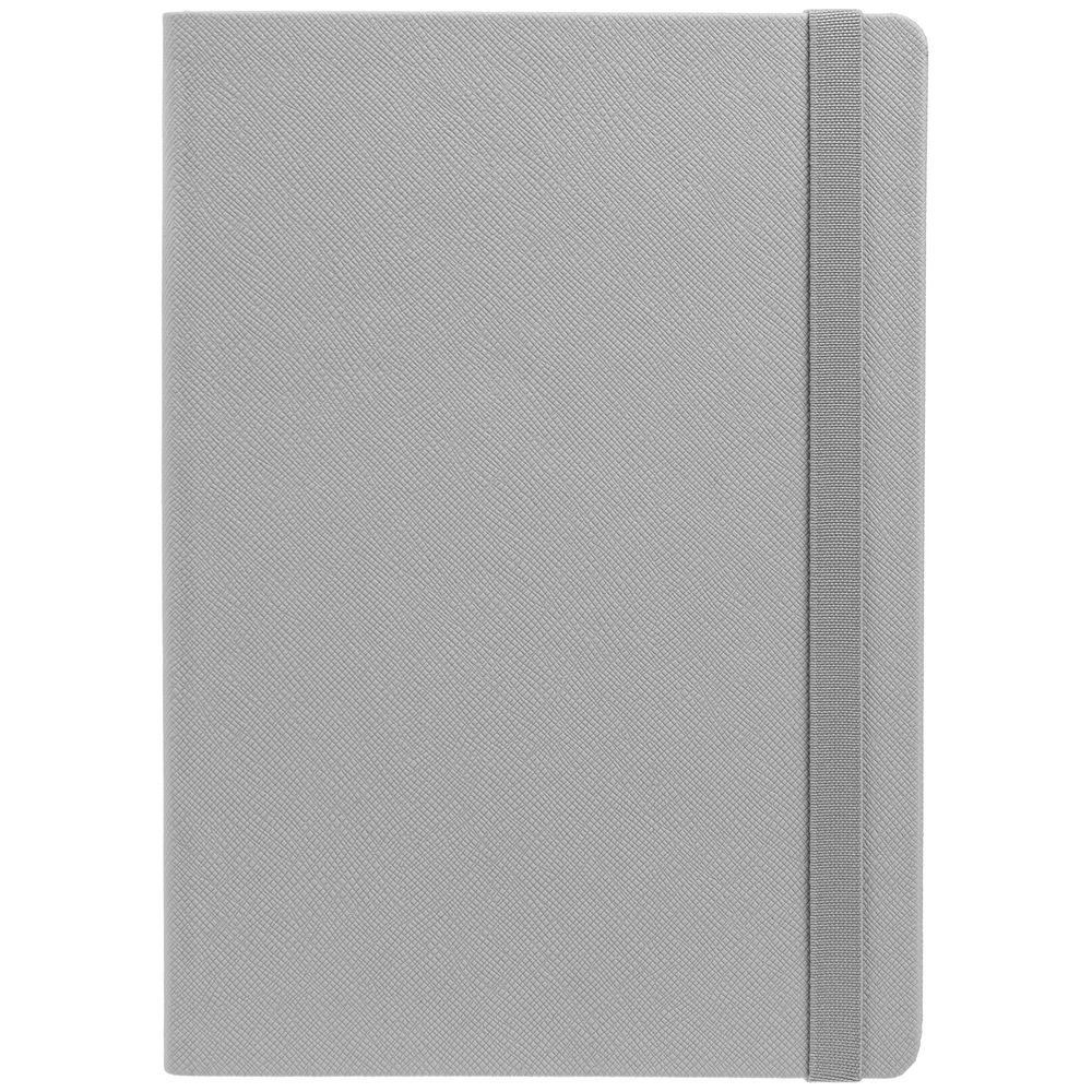 Ежедневник с твердой обложкой выполнен из материала Nice Touch, серый СС, и дополнен резинкой шириной 1 см и ляссе серого цвета.