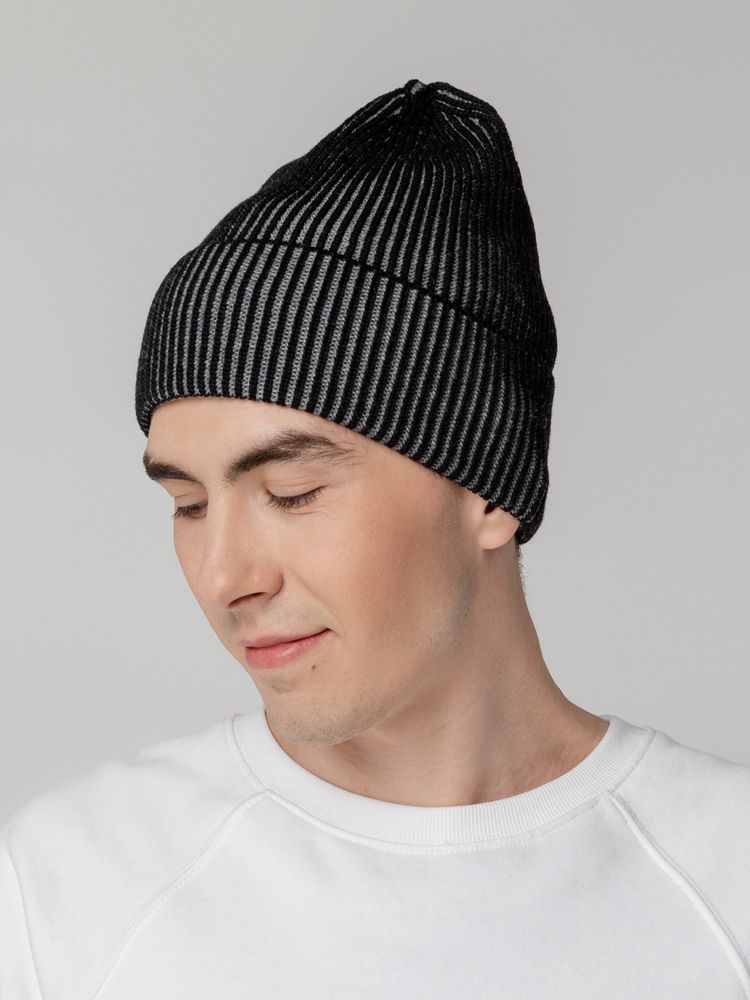 Удлиненная двухцветная шапка из полушерстяной пряжи идеально подходит для создания яркого и современного городского образа и будет удачно смотреться с верхней одеждой разных стилей.