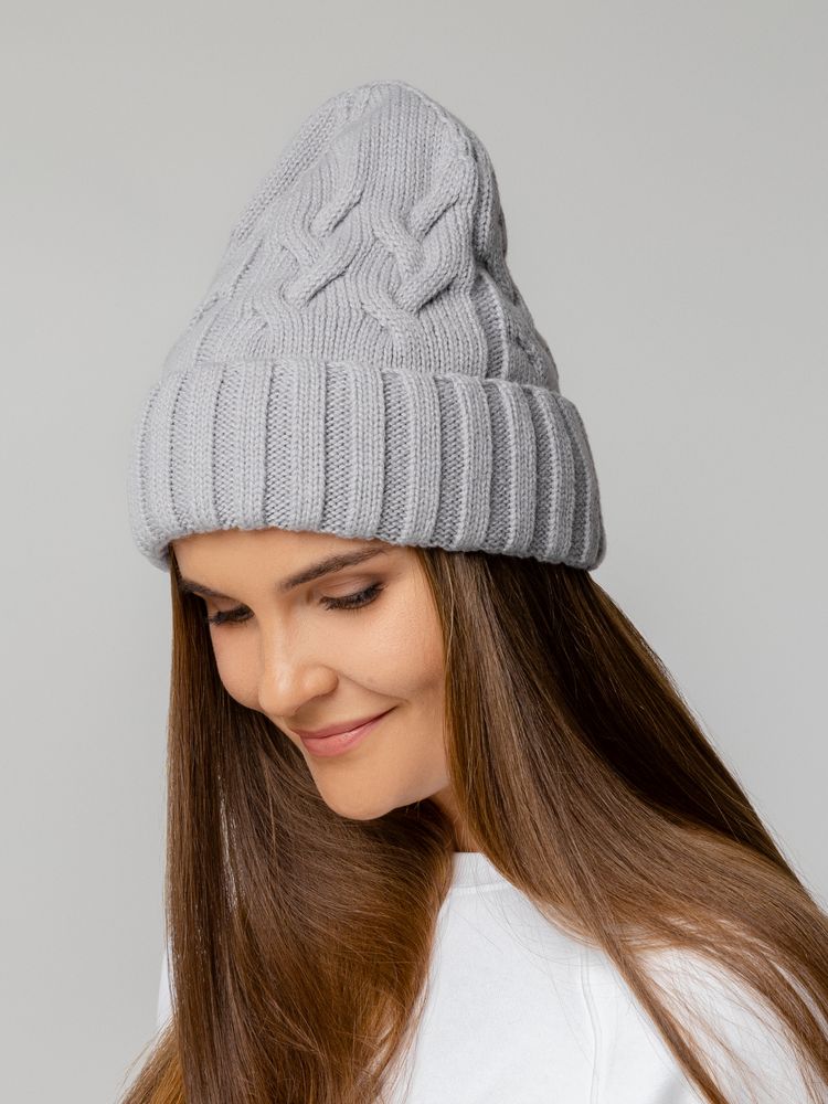 Однослойная шапка фактурной вязки с объемными косами и рельефным отворотом.
