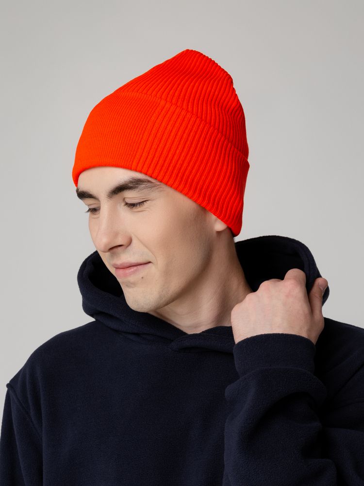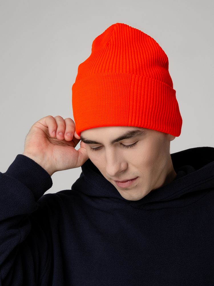 Двухслойная шапка фактурной вязки с отворотом и специальной более гладкой областью под вышивку.