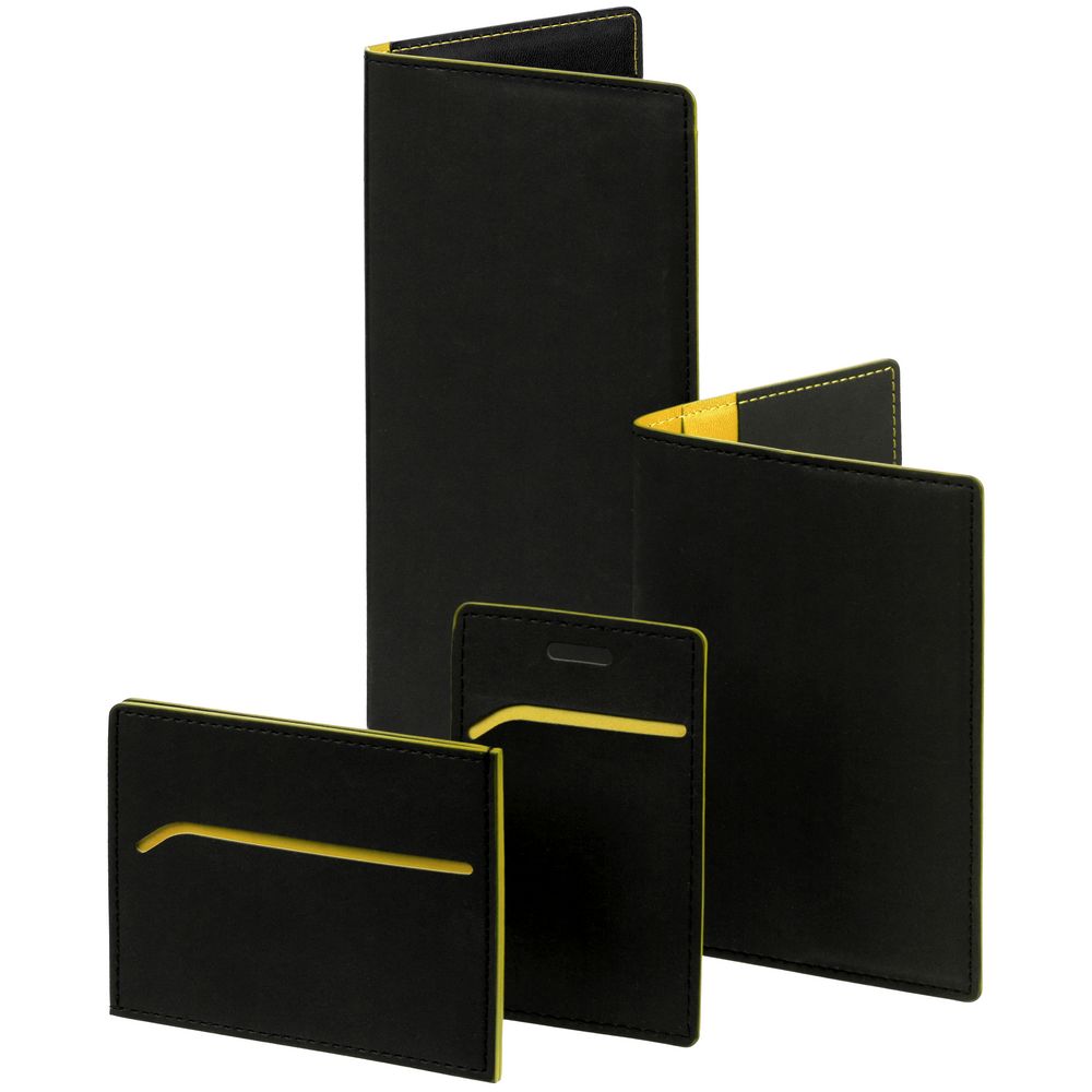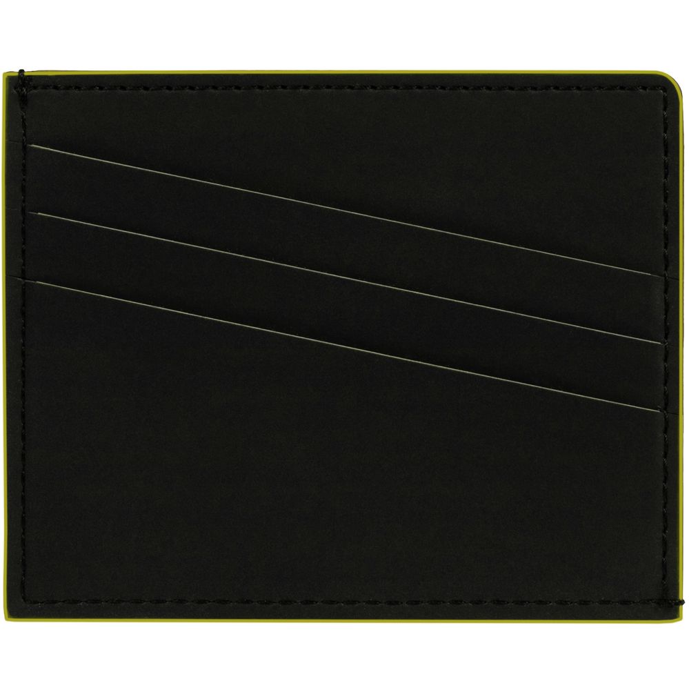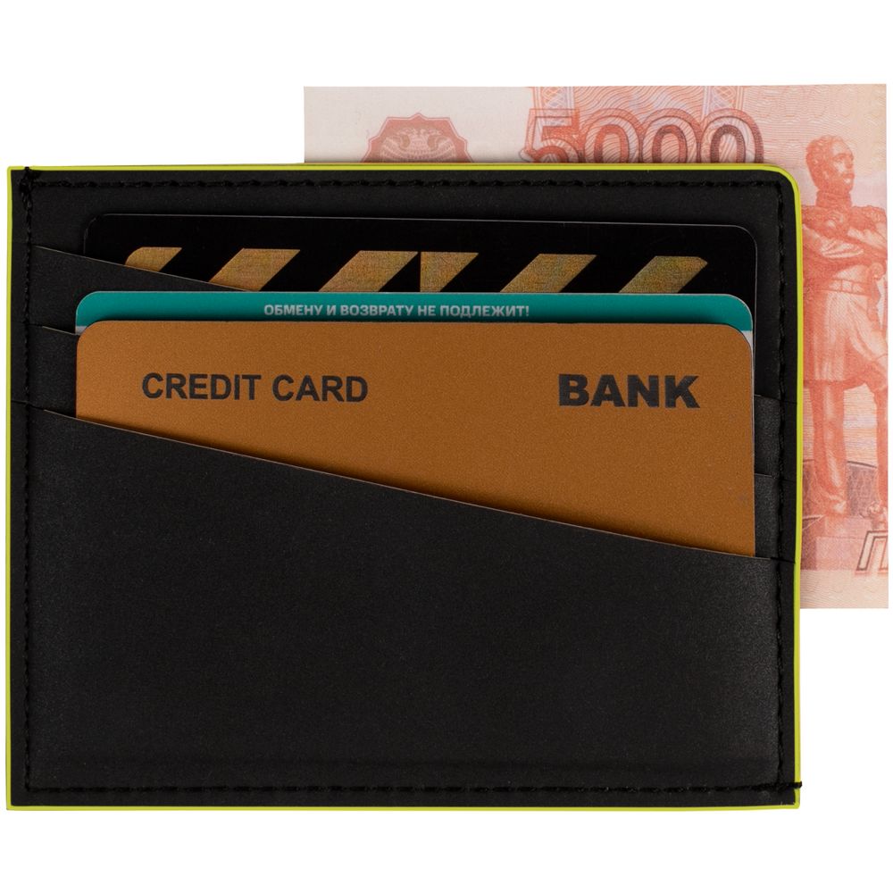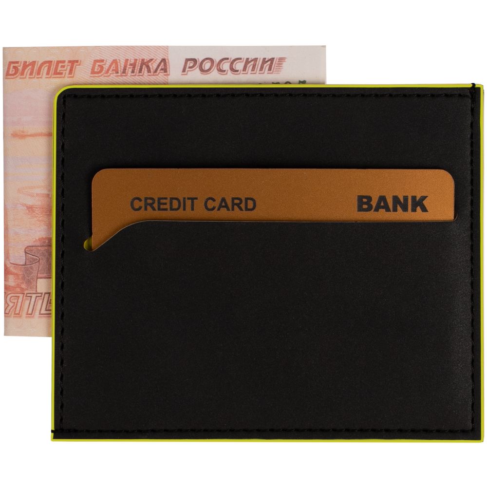 Чехол выполнен из материала Soft Touch Pearl, черный АА, дополнен окрашенным срезом края и внутренним карманом из цветного картона. Имеет 4 отделения для кредитных карт и 1 отделение для купюр.