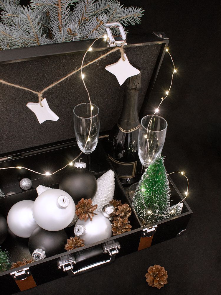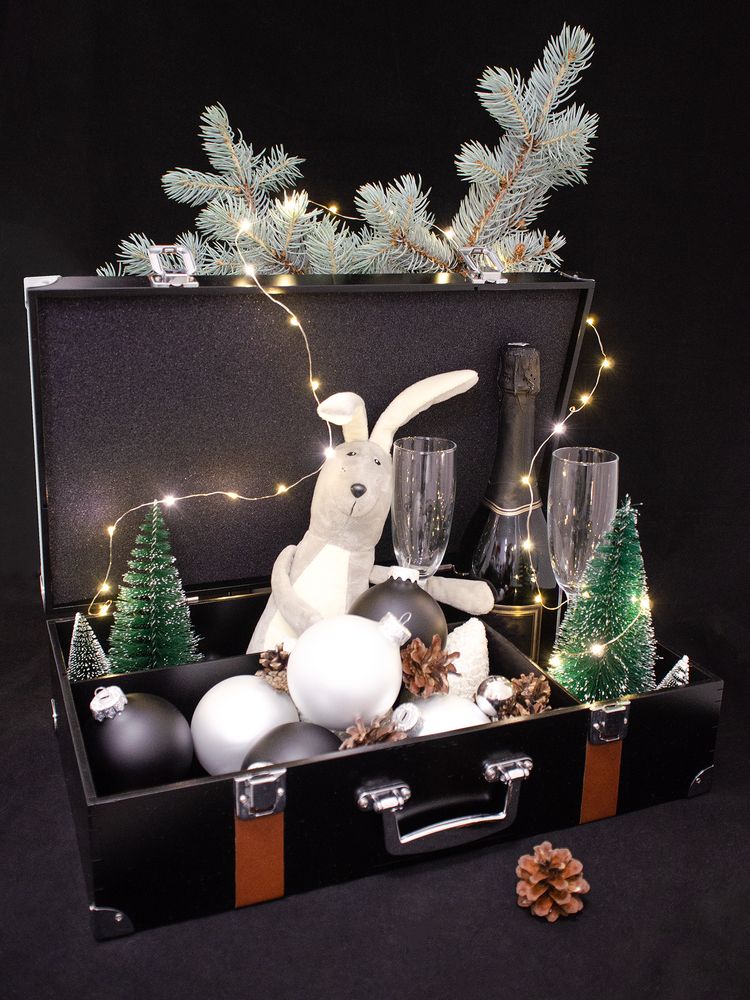 Просто добавьте в него самое главное — бутылку игристого, праздничные бокалы, новогодние игрушки, особенный подарок-сюрприз. Для предметов разных габаритов предусмотрены удобные отсеки. Осталось только определить Час Икс и установить таймер: именно в этот момент чемоданчик можно будет открыть.
