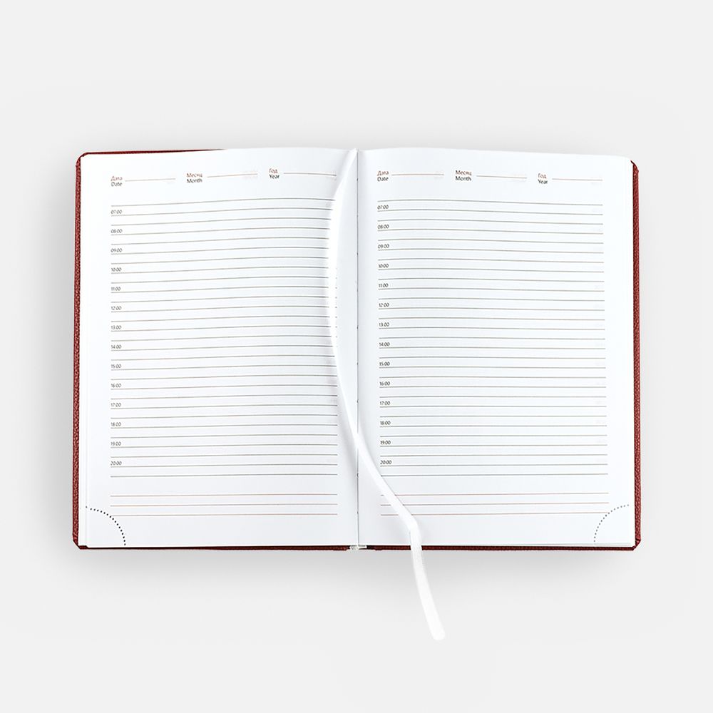 Ежедневник в твердой обложке c поролоном, выполнен из материала La Fite, красный РР, дополнен ляссе белого цвета.
