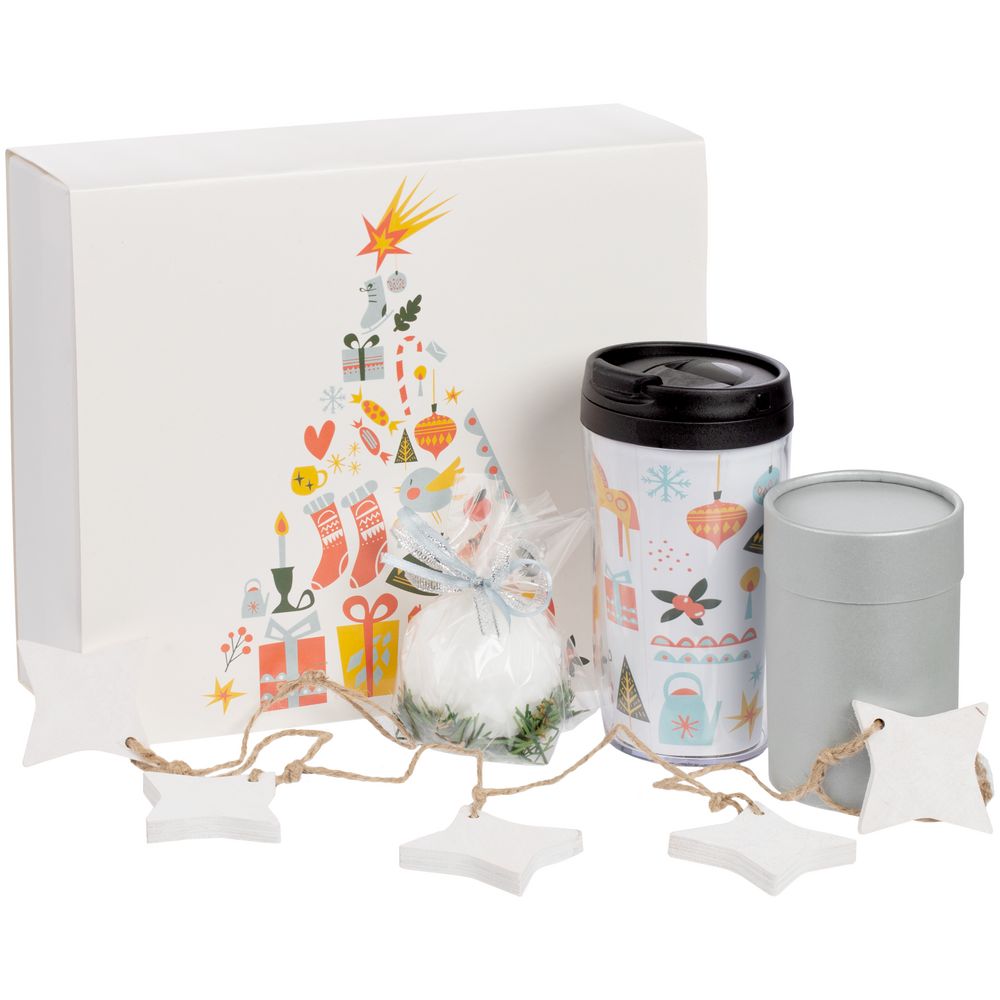 термостакан - пластик; свеча - парафин; гирлянда - дерево; коробка - переплетный картон