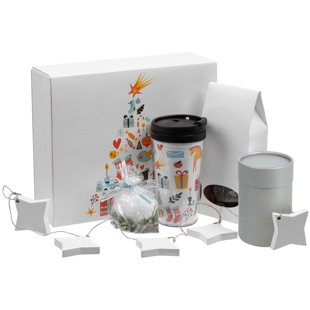 Набор упакован в подарочную белую коробку с принтом и новогодним шубером.