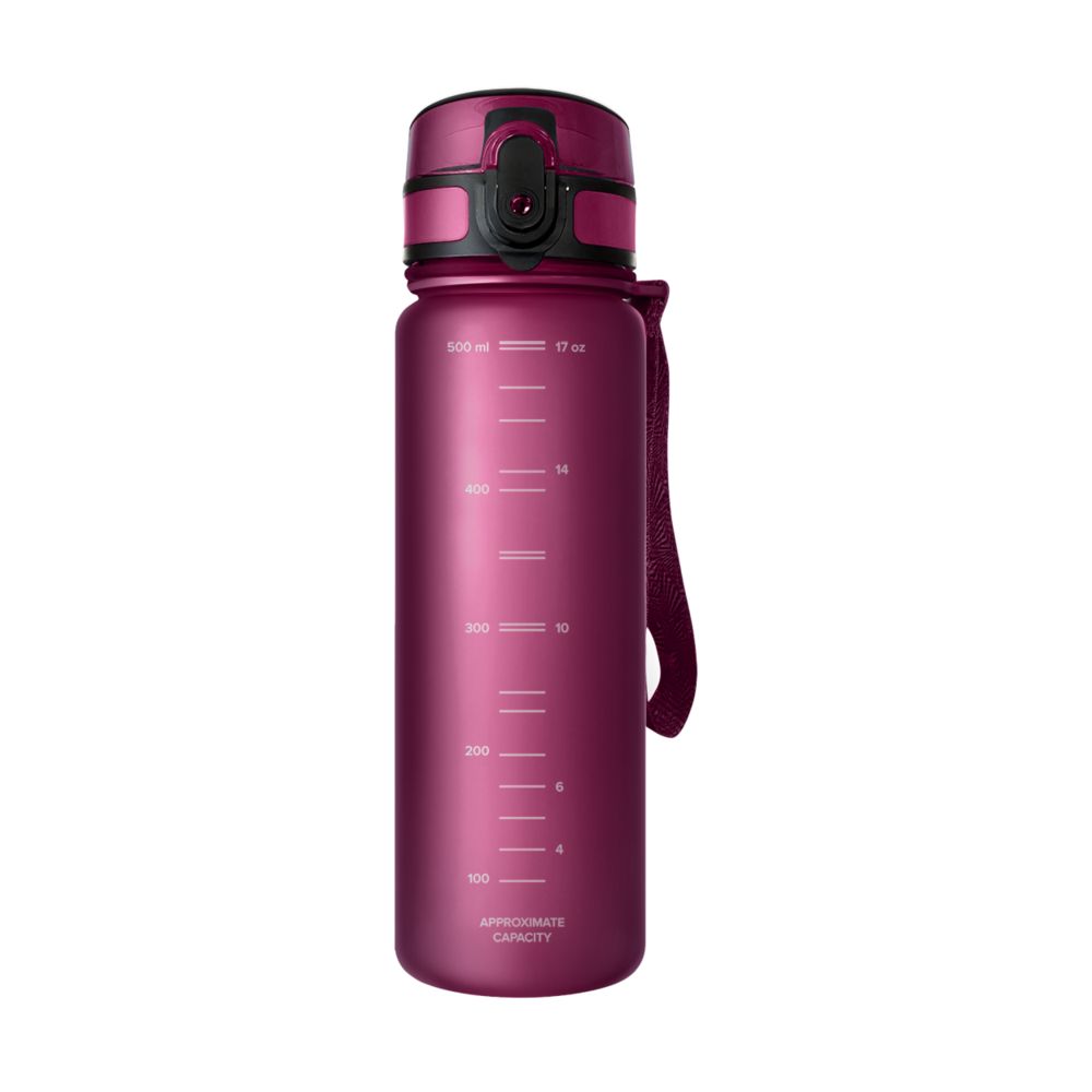 Матовое бархатистое покрытие бутылки приятно на ощупь, широкий ремешок дополнительно фиксирует бутылку во время использования, защитный колпачок не даст воде пролиться в сумке.