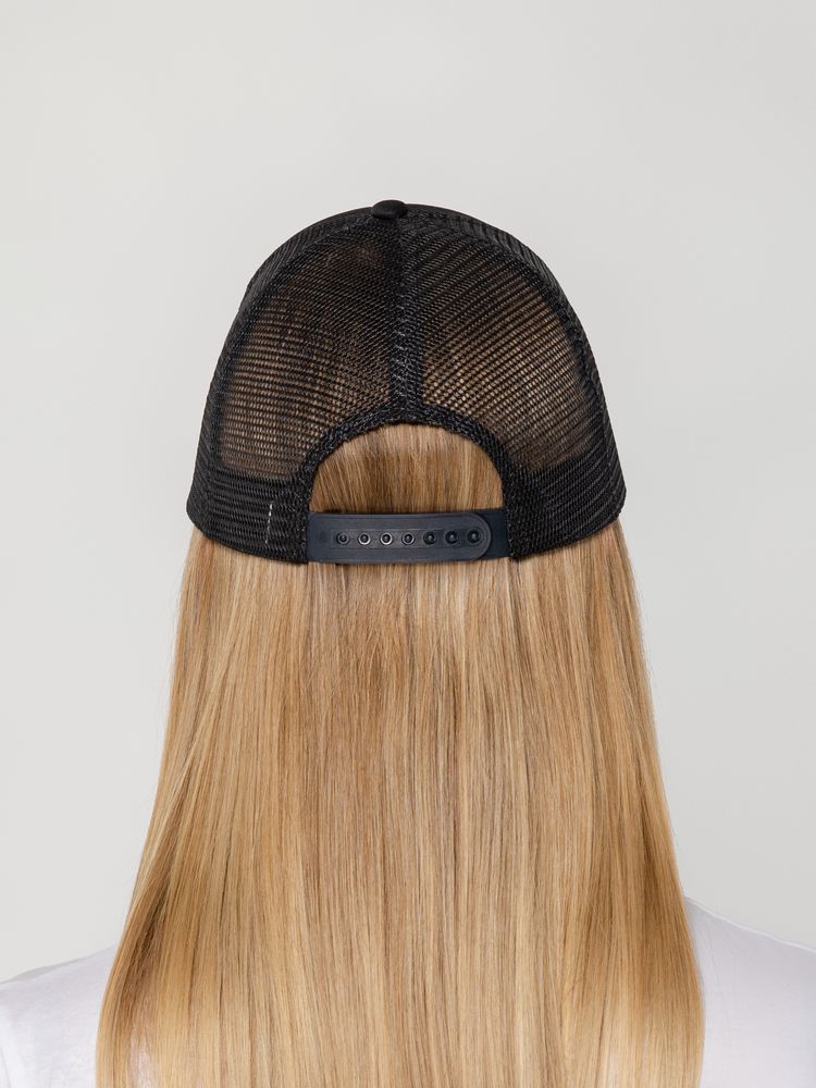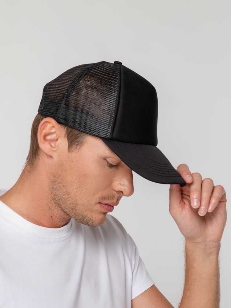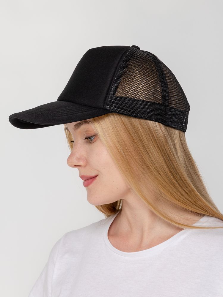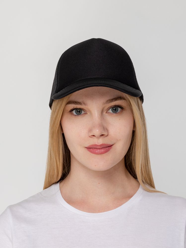 Стандартная модель с 5 клиньями без лобового шва в нестандартном исполнении. Передний клин и козырек выполнены из полиэстера с наполнителем из поролона, боковые и задние клинья — из сетки. Размер регулируется с помощью пластиковой застежки.