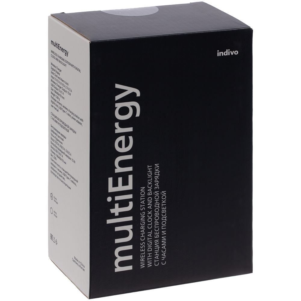 multiEnergy — многофункциональное устройство, которое сочетает в себе возможности беспроводной и проводной зарядки гаджетов, настольных часов с календарем и термометром, будильника и ночника.