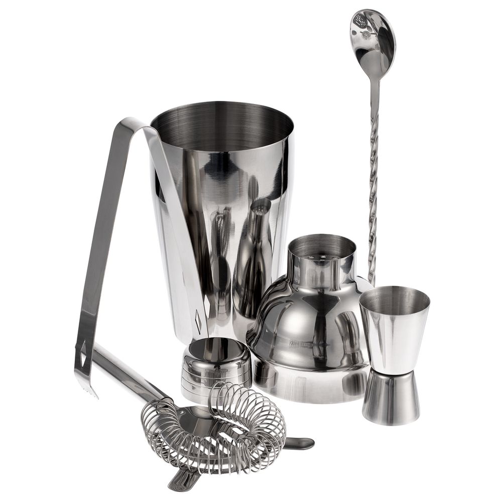 Отмерить нужное количество ингредиентов для напитка поможет мерный стаканчик — джиггер, барной ложкой удобно насыпать специи, а обратной ее стороной — разминать сочные кусочки фруктов. Щипцы пригодятся для добавления в шейкер кусочков льда или сахара, а ситечко-стрейнер поможет отделить коктейль от льда и мякоти фруктов, когда понадобится перелить уже готовый напиток из шейкера в стакан.В наборе: