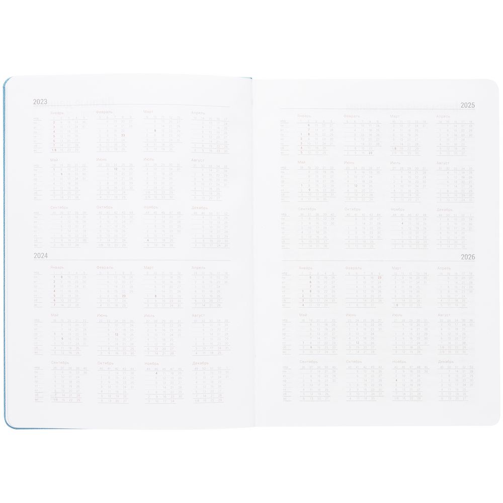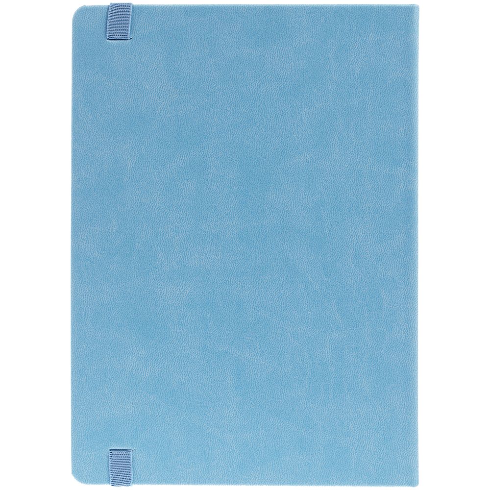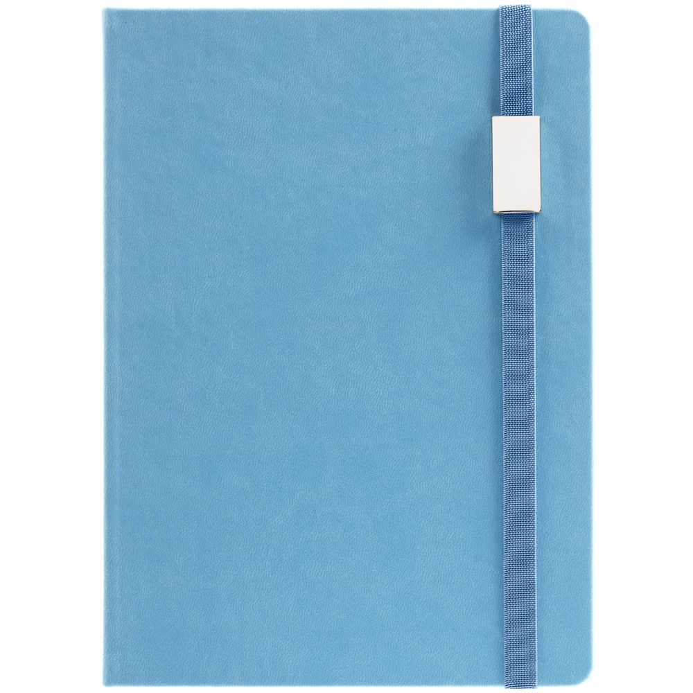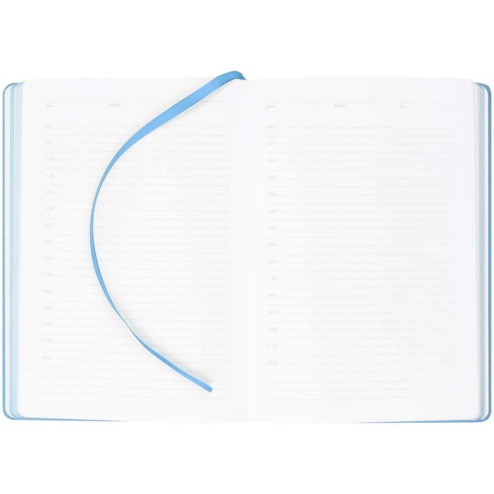 Ежедневник с твердой обложкой, выполнен из материала Latte, голубой JJ, обрез голубого цвета, дополнен ляссе голубого цвета и резинкой с металлическим шильдом.