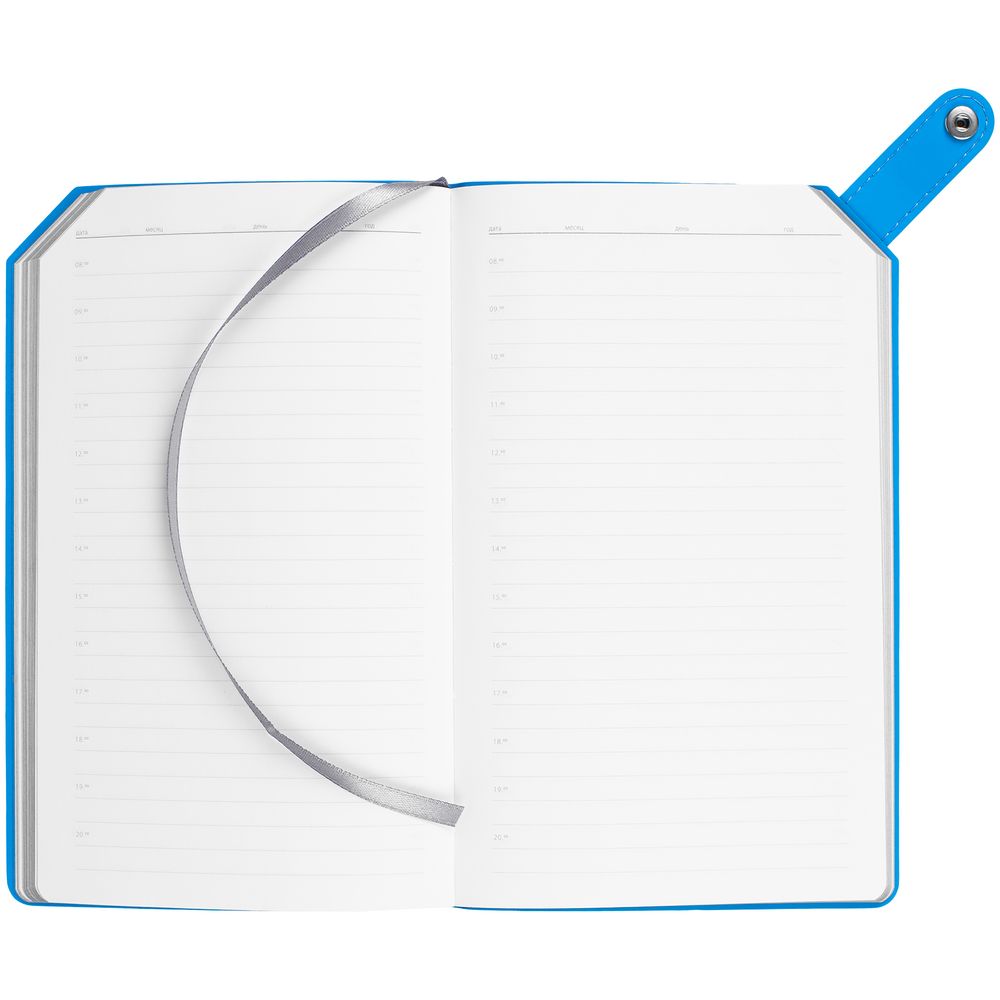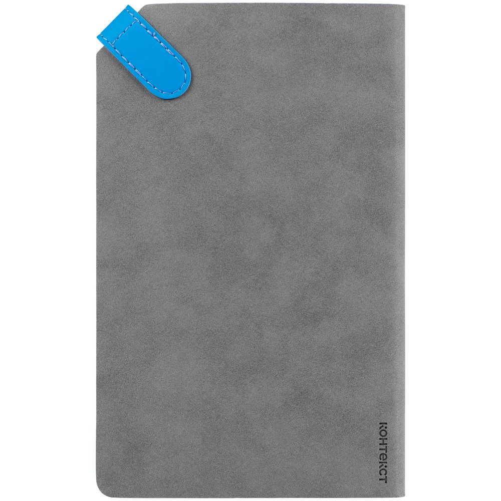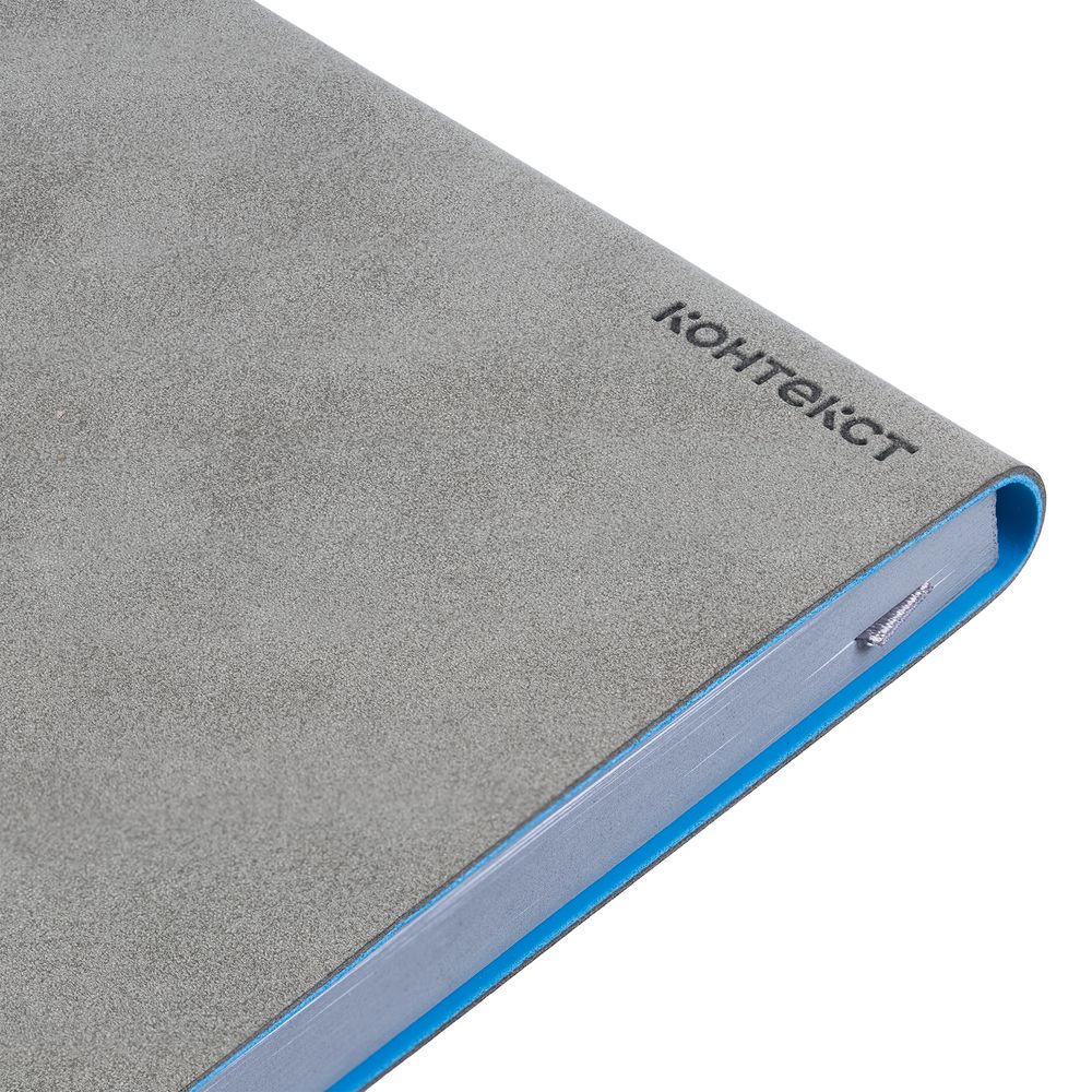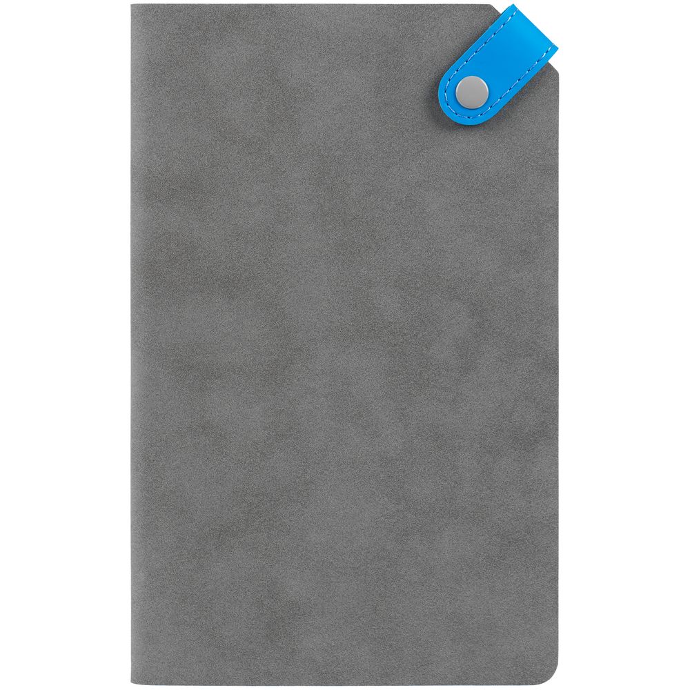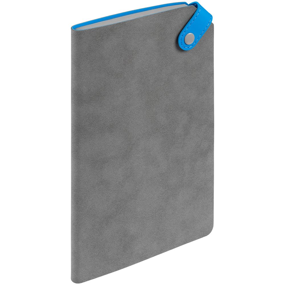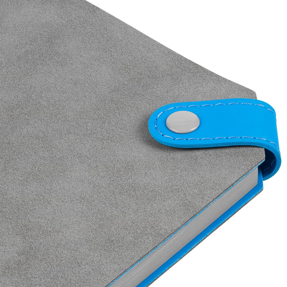 Ежедневник с гибкой обложкой, выполнен из материала Nubuck, серый СС и Soft Touch Ultra, голубой, дополнен серым ляссе и хлястиком на кнопке.
