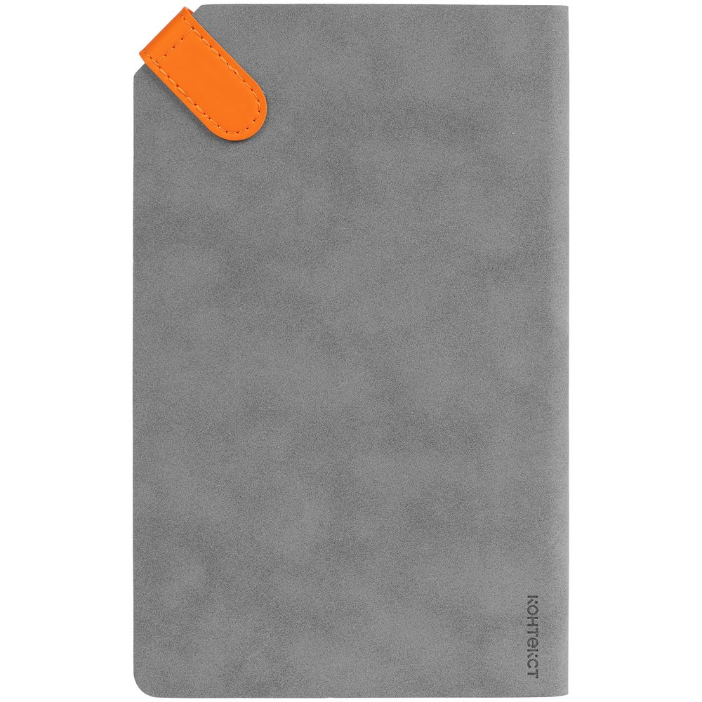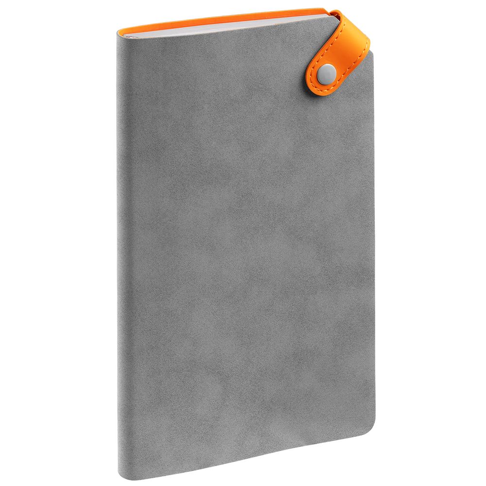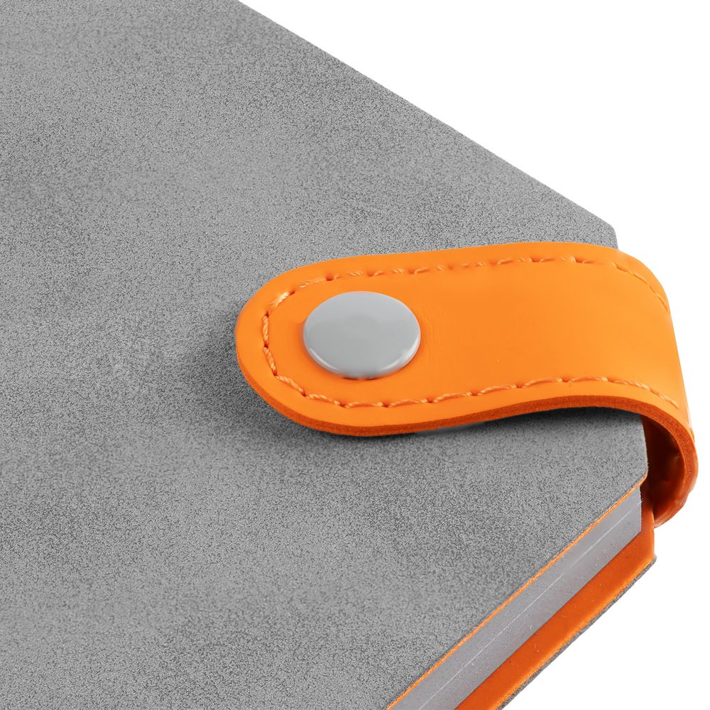 Ежедневник с гибкой обложкой, выполнен из материала Nubuck, серый СС и Soft Touch, оранжевый ОО, дополнен серым ляссе и хлястиком на кнопке.