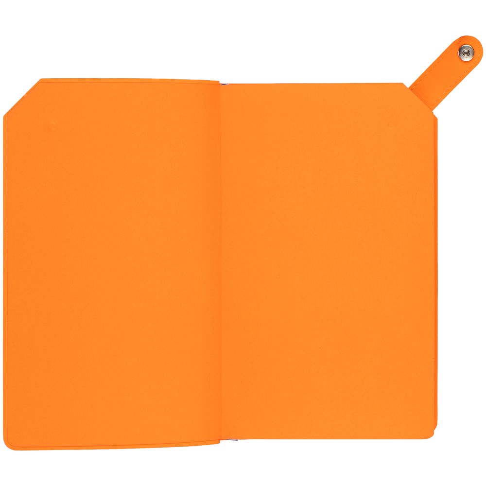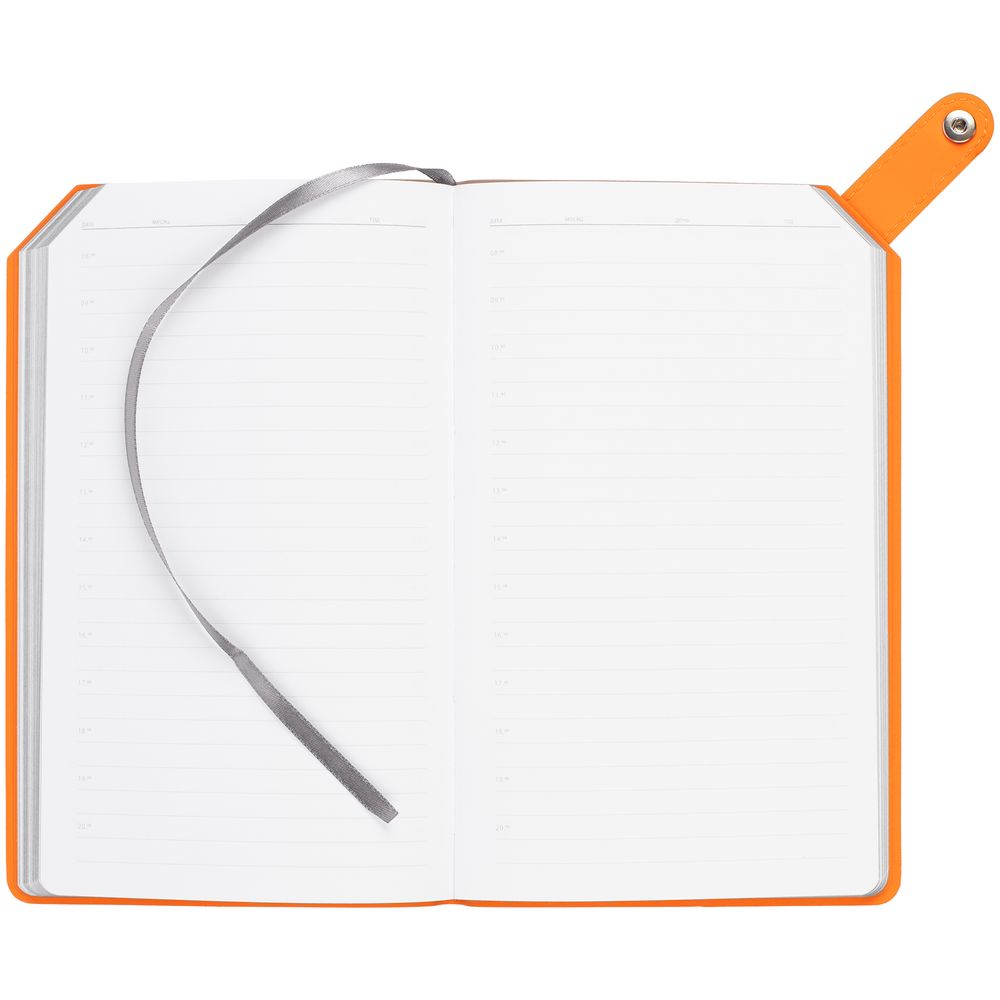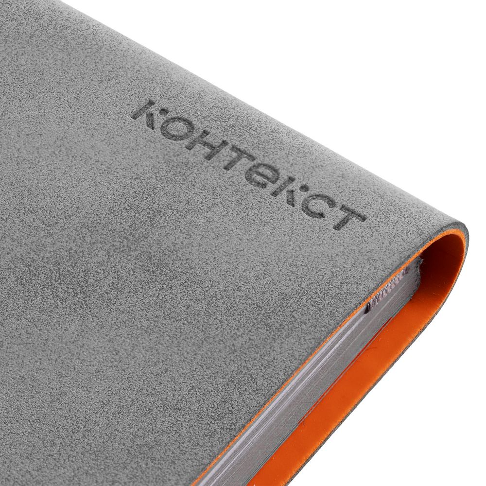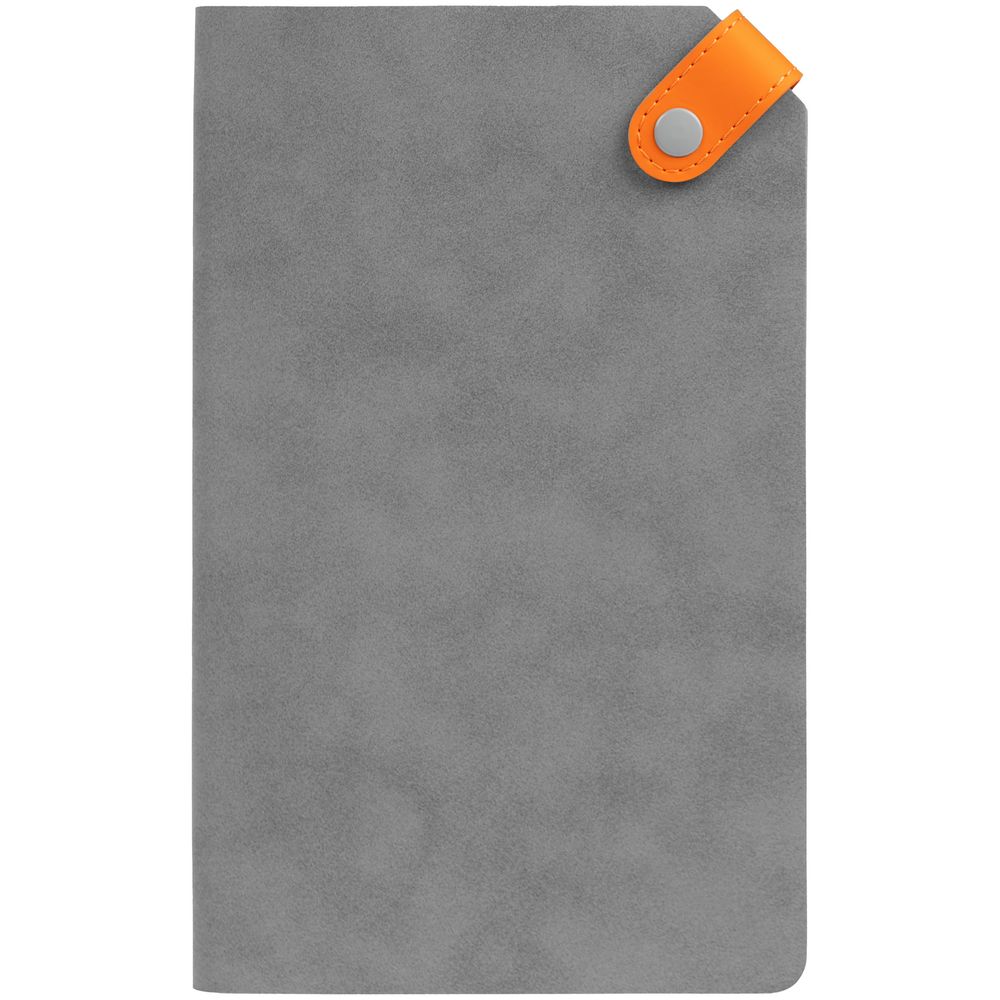 Ежедневник с гибкой обложкой, выполнен из материала Nubuck, серый СС и Soft Touch, оранжевый ОО, дополнен серым ляссе и хлястиком на кнопке.