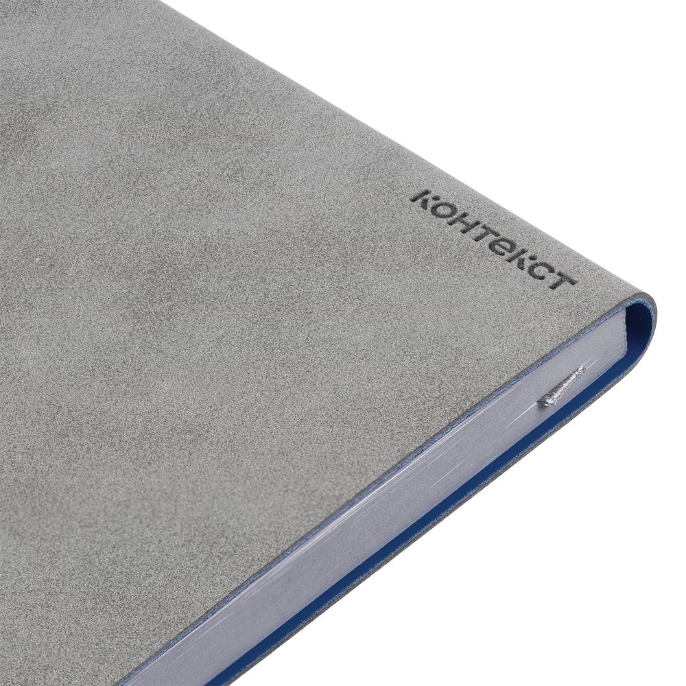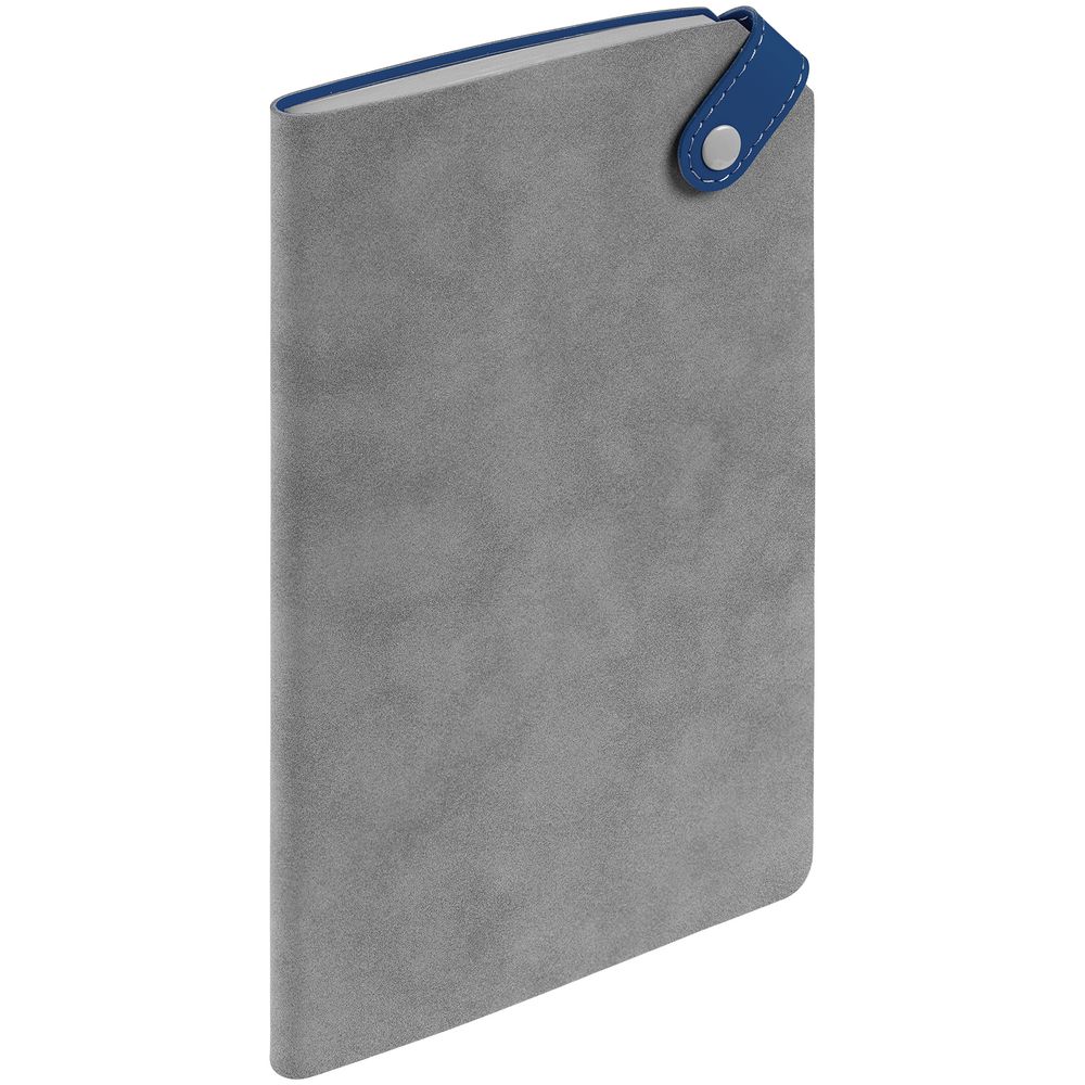 Ежедневник с гибкой обложкой, выполнен из материала Nubuck, серый СС и Soft Touch Ultra, синий; дополнен серым ляссе и хлястиком на кнопке.