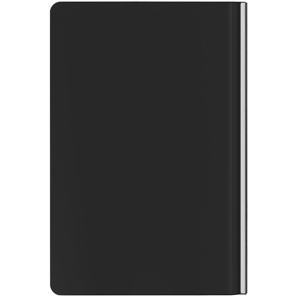 Ежедневник с гибкой обложкой и металлическим корешком, выполнен из материала Soft Touch, черный АА, дополнен серебристым обрезом блока и ляссе.
