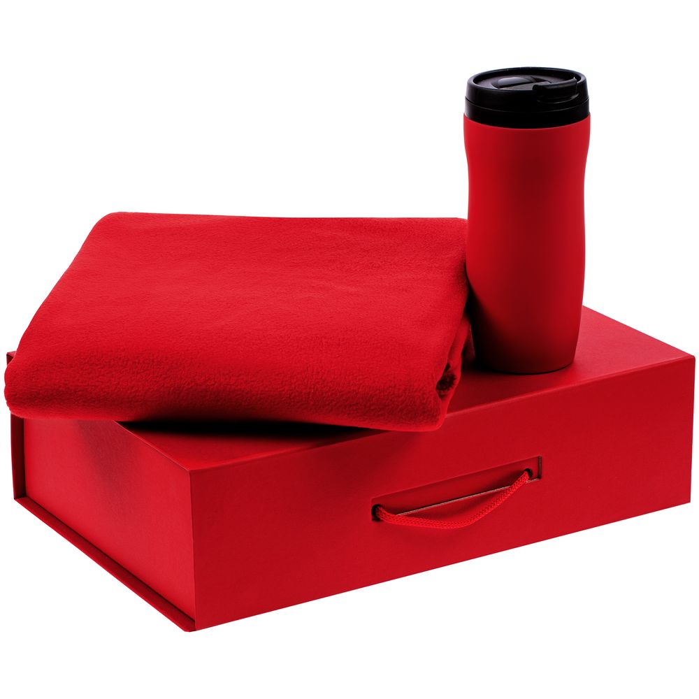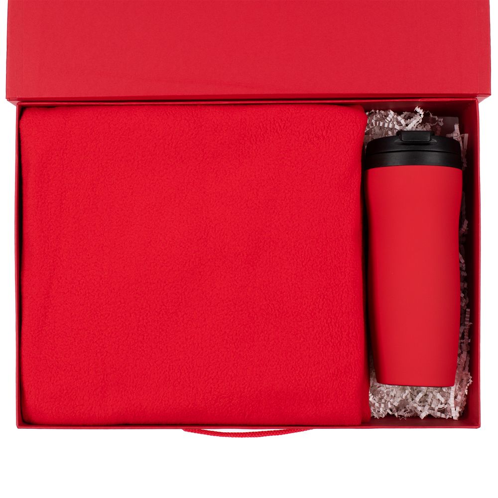 покрытие софт-тач; термостакан - пластик, крышка, внутренняя колба; нержавеющая сталь, корпус; плед - флис, плотность 180 г/м²; коробка - переплетный картон; наполнитель - бумага