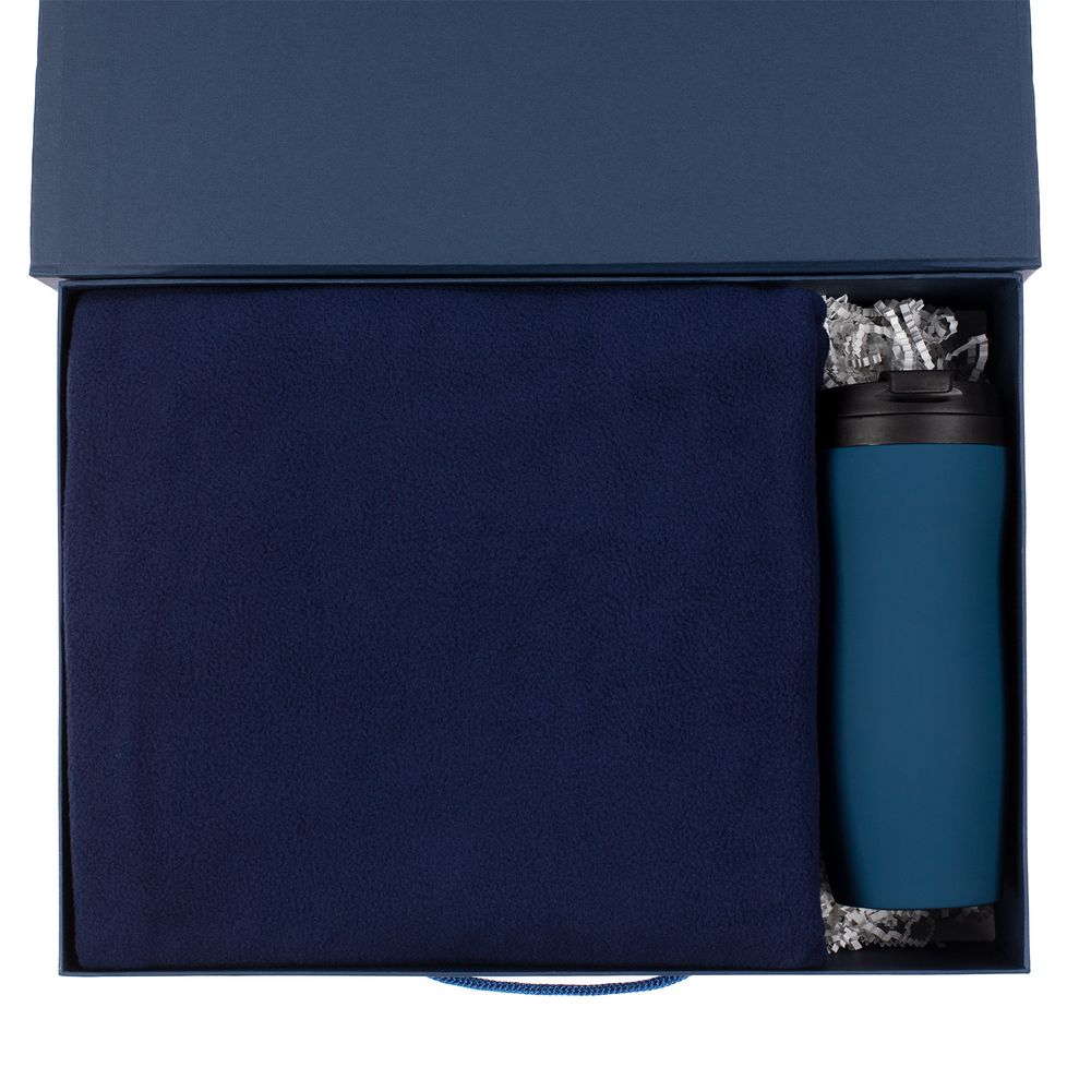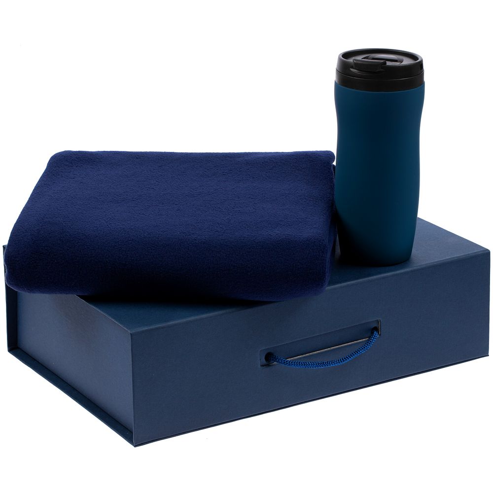 термостакан - пластик, крышка, внутренняя колба; нержавеющая сталь, корпус; покрытие софт-тач; плед - флис, плотность 180 г/м²; коробка - переплетный картон; наполнитель - бумага