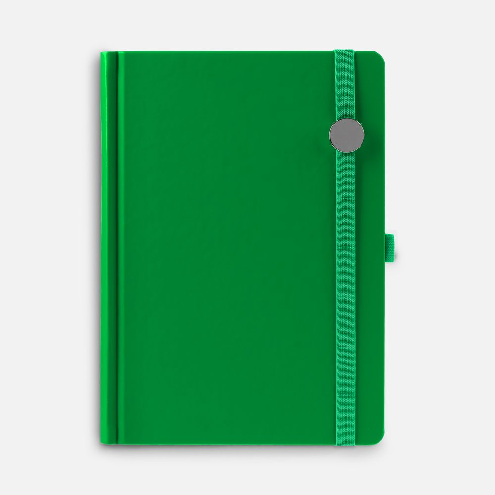 Ежедневник с твердой обложкой без поролона, выполнен из материала Soft Touch Ultra, зеленый FF, дополнен резинкой шириной 1 см, петлей-резинкой для ручки, капталом и ляссе ярко-зеленого цвета.