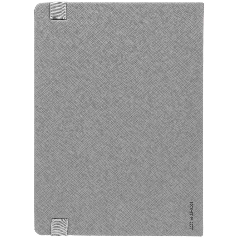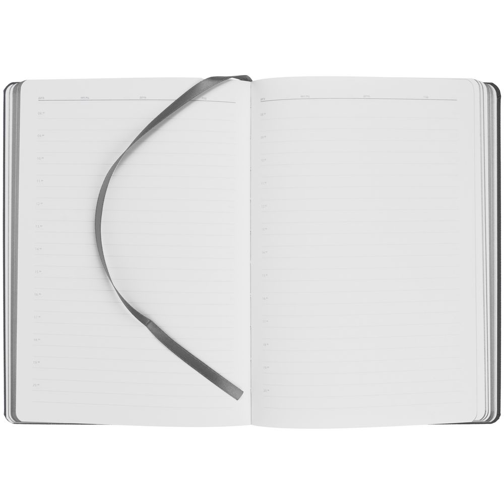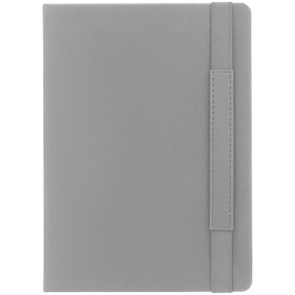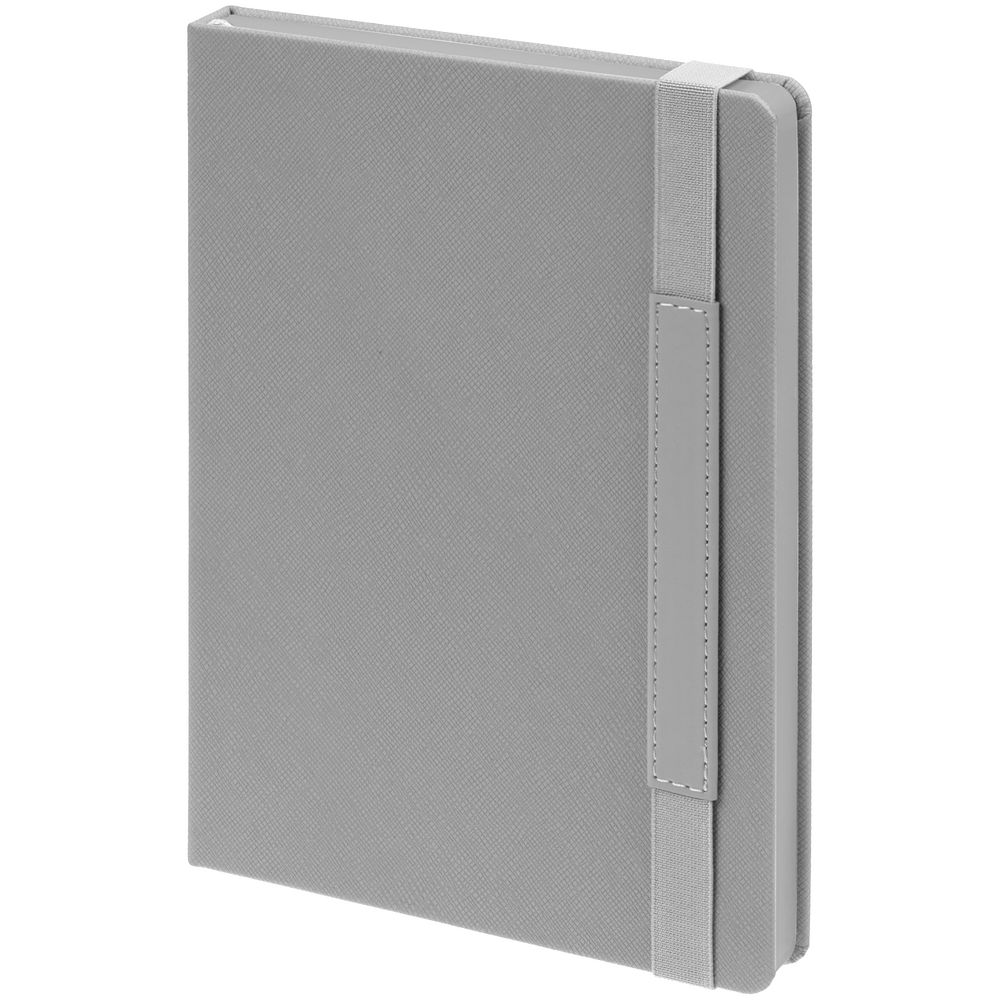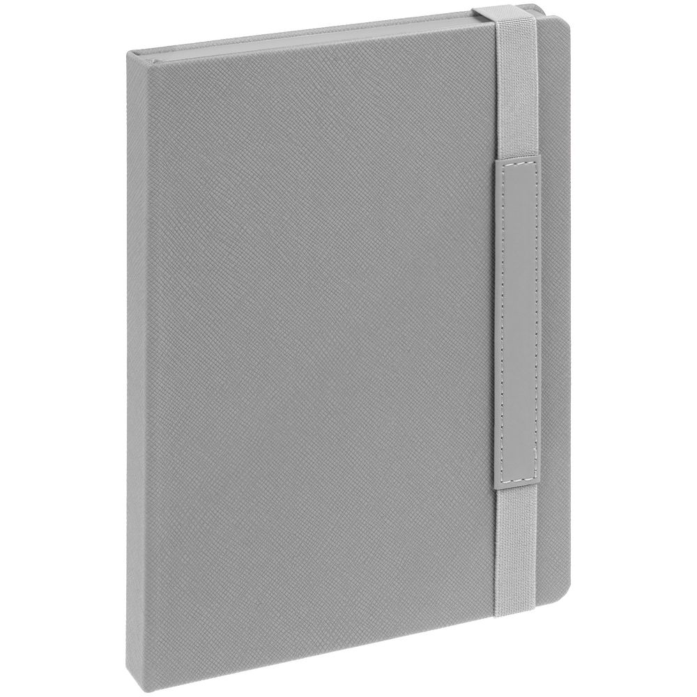 Ежедневник с твердой обложкой, выполнен из материала Nice Touch, серый СС, дополнен резинкой с шильдой из материала Soft Touch и ляссе в цвет обложки.