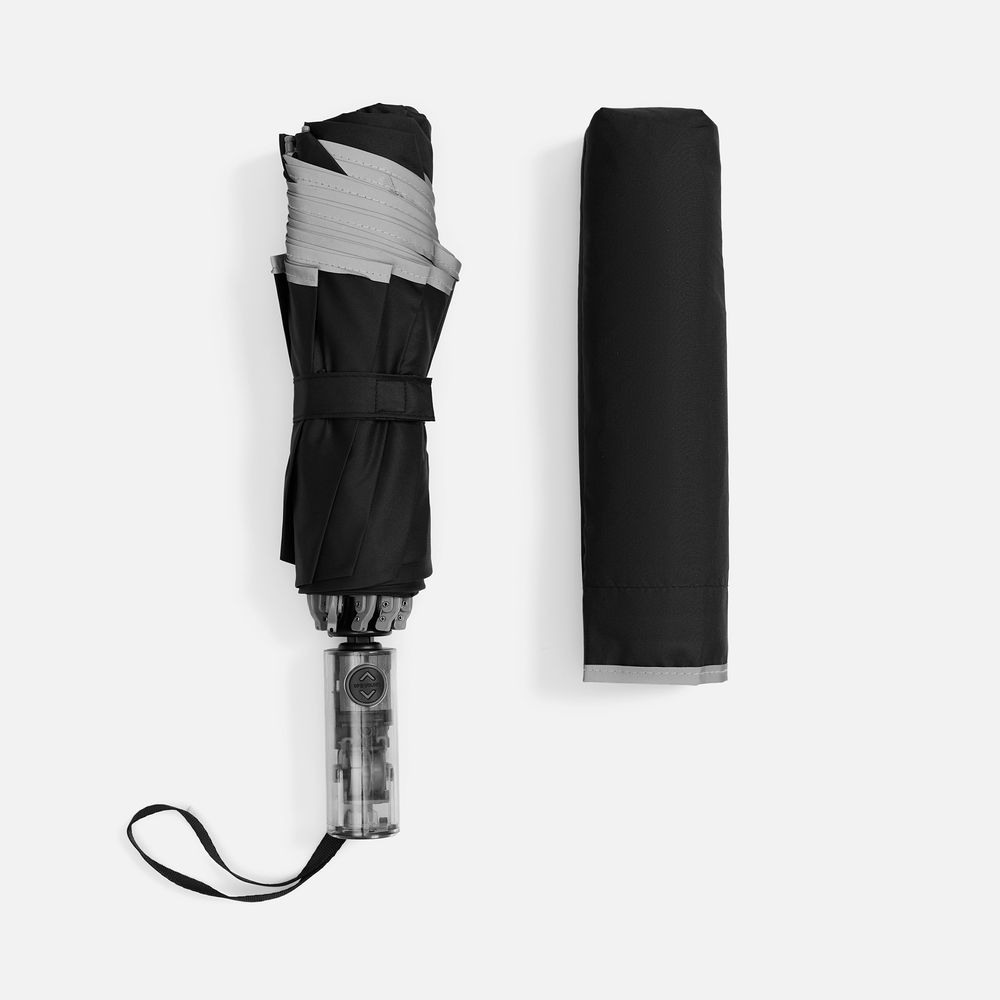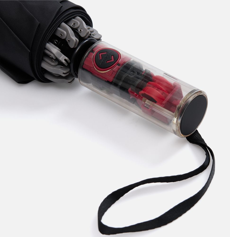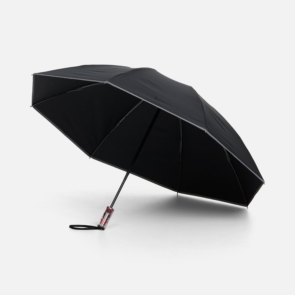 Складной зонт Futurum привлекает внимание оригинальным дизайном. Складываясь после дождя, он прячет мокрую поверхность в себя, а сухая остается снаружи. Светоотражающий кант и ручка из прозрачного пластика, не скрывающая ярких деталей внутри, добавляют внешнему виду зонта футуристичности.