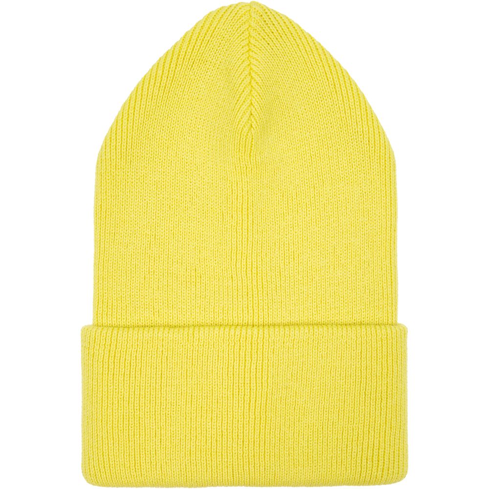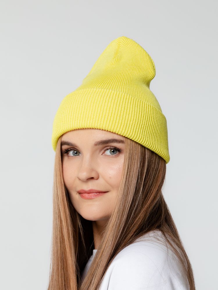 Двухслойная шапка, связанная резинкой, с широким отворотом.