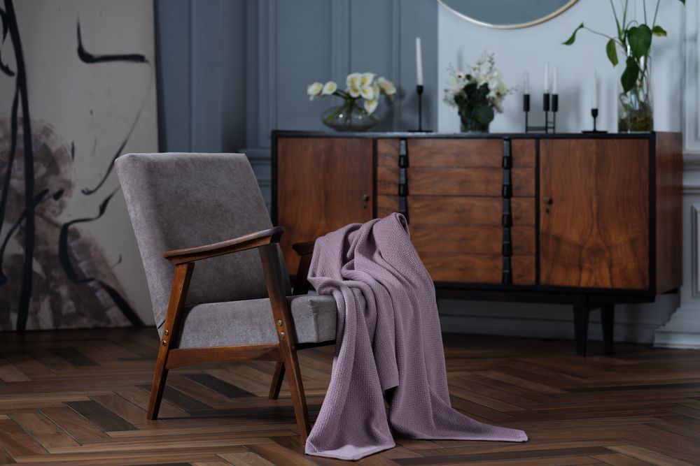 Плед из полушерстяной пряжи, поэтому прекрасно согревает и неприхотлив в уходе.
