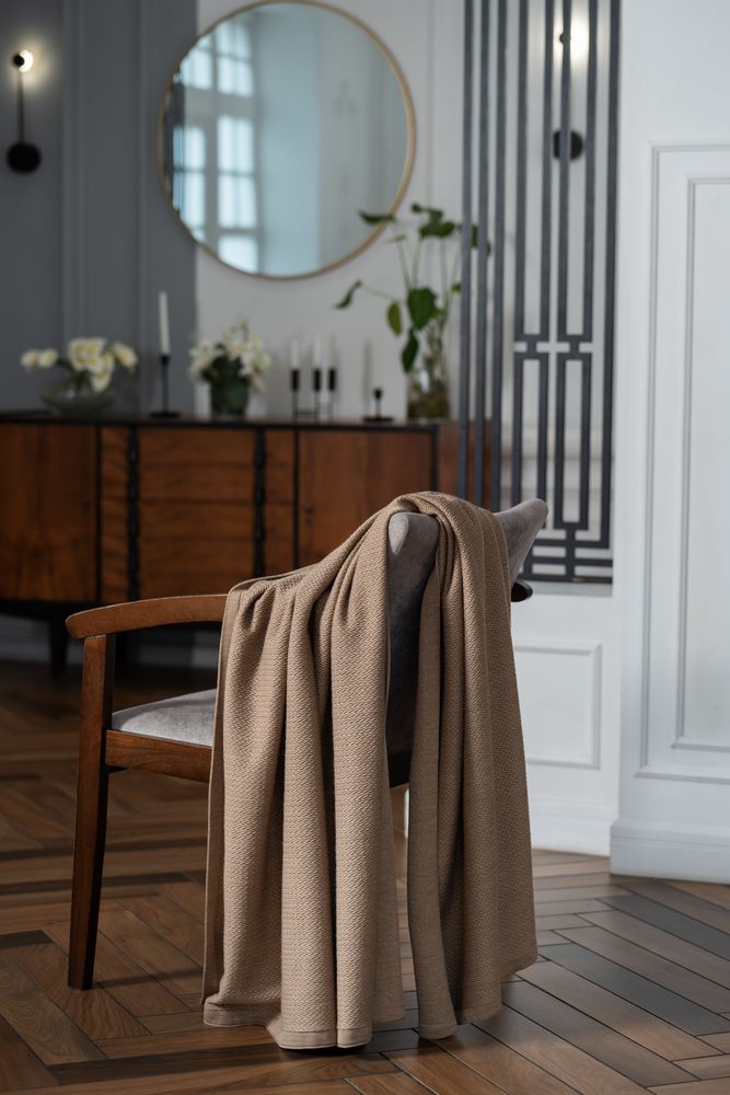 Плед из полушерстяной пряжи, поэтому прекрасно согревает и неприхотлив в уходе.