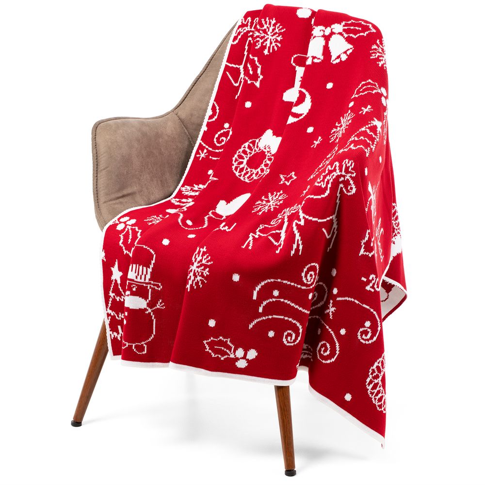 Плед с вывязанным логотипом и индивидуальным рисунком в фирменной цветовой гамме.
