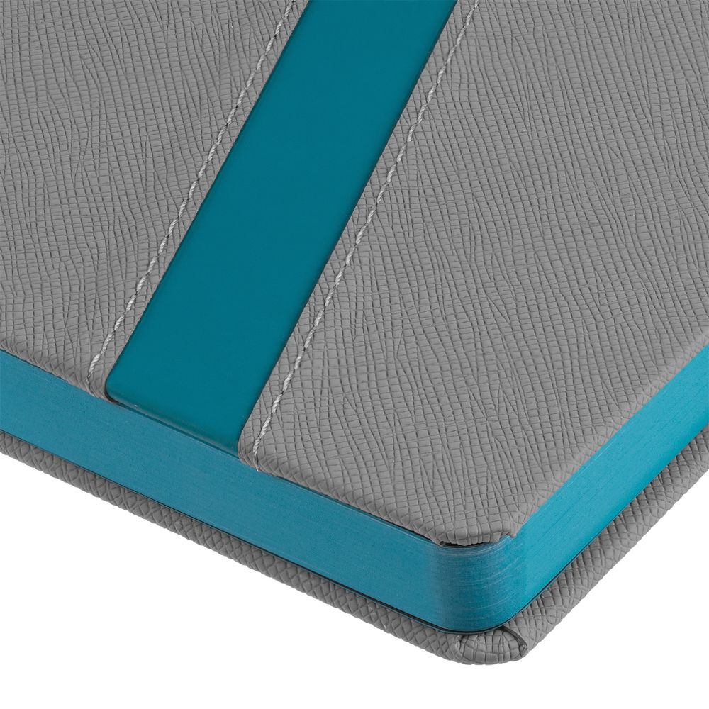 Ежедневник с твердой обложкой и тонированным обрезом. Выполнен из материала Nice Touch, серый СС, и Soft Touch, цвет морской волны II, дополнен серым ляссе.