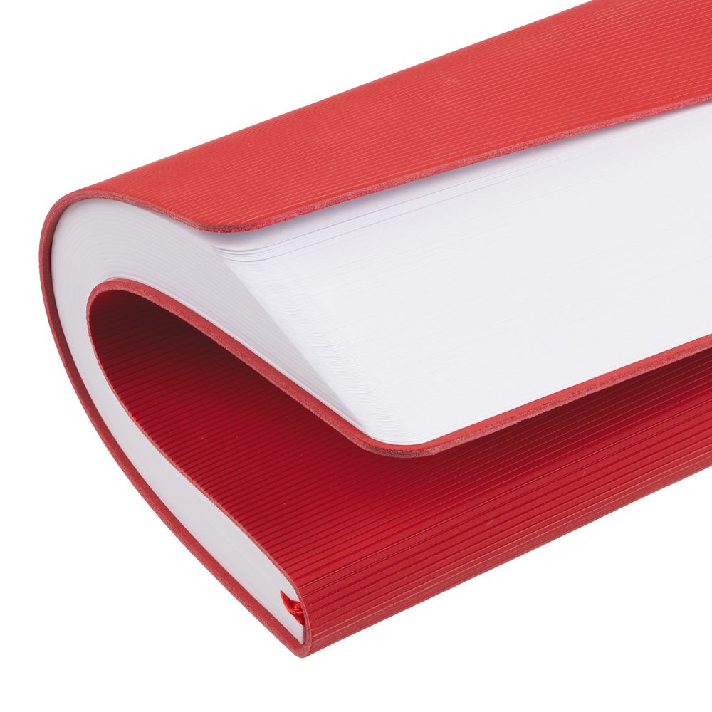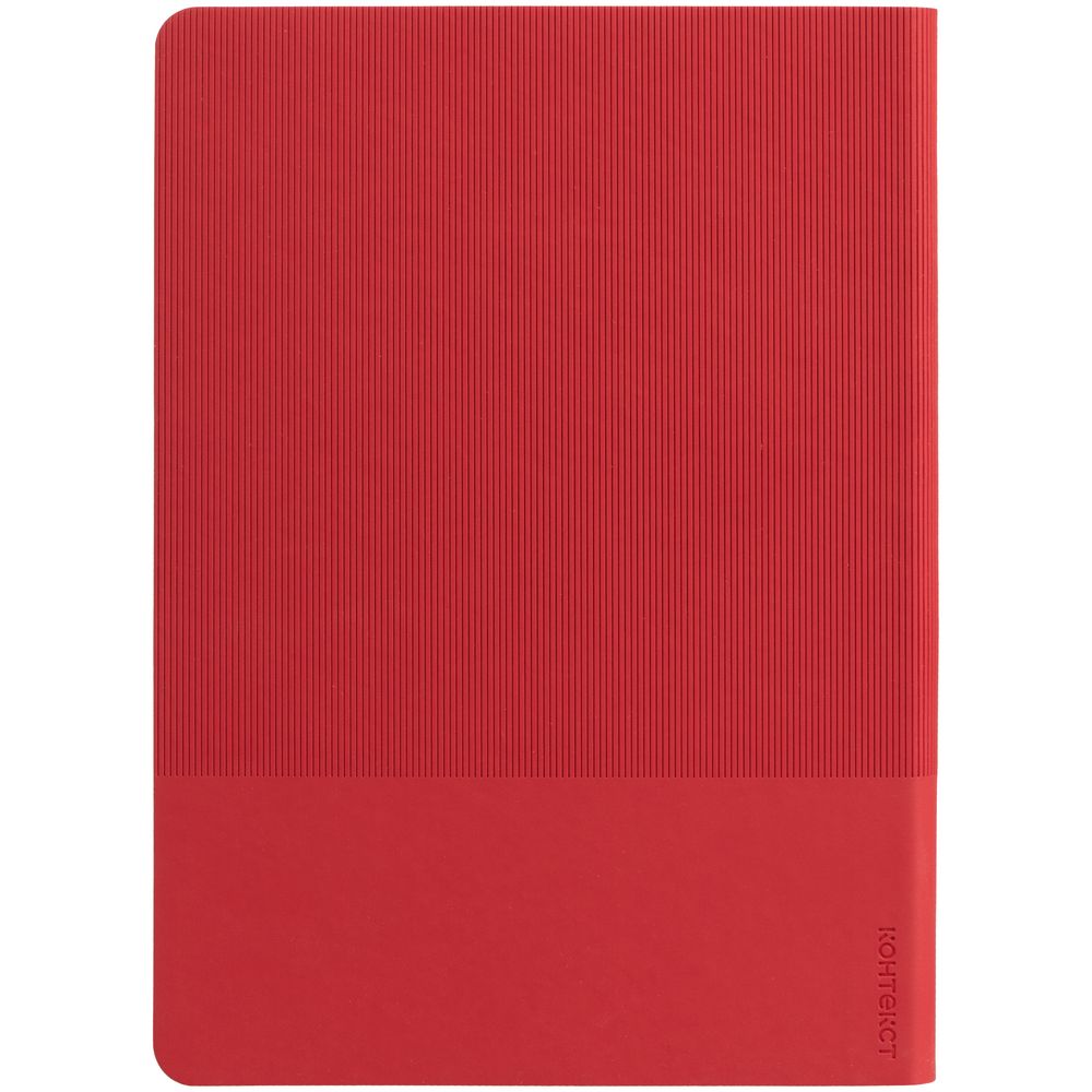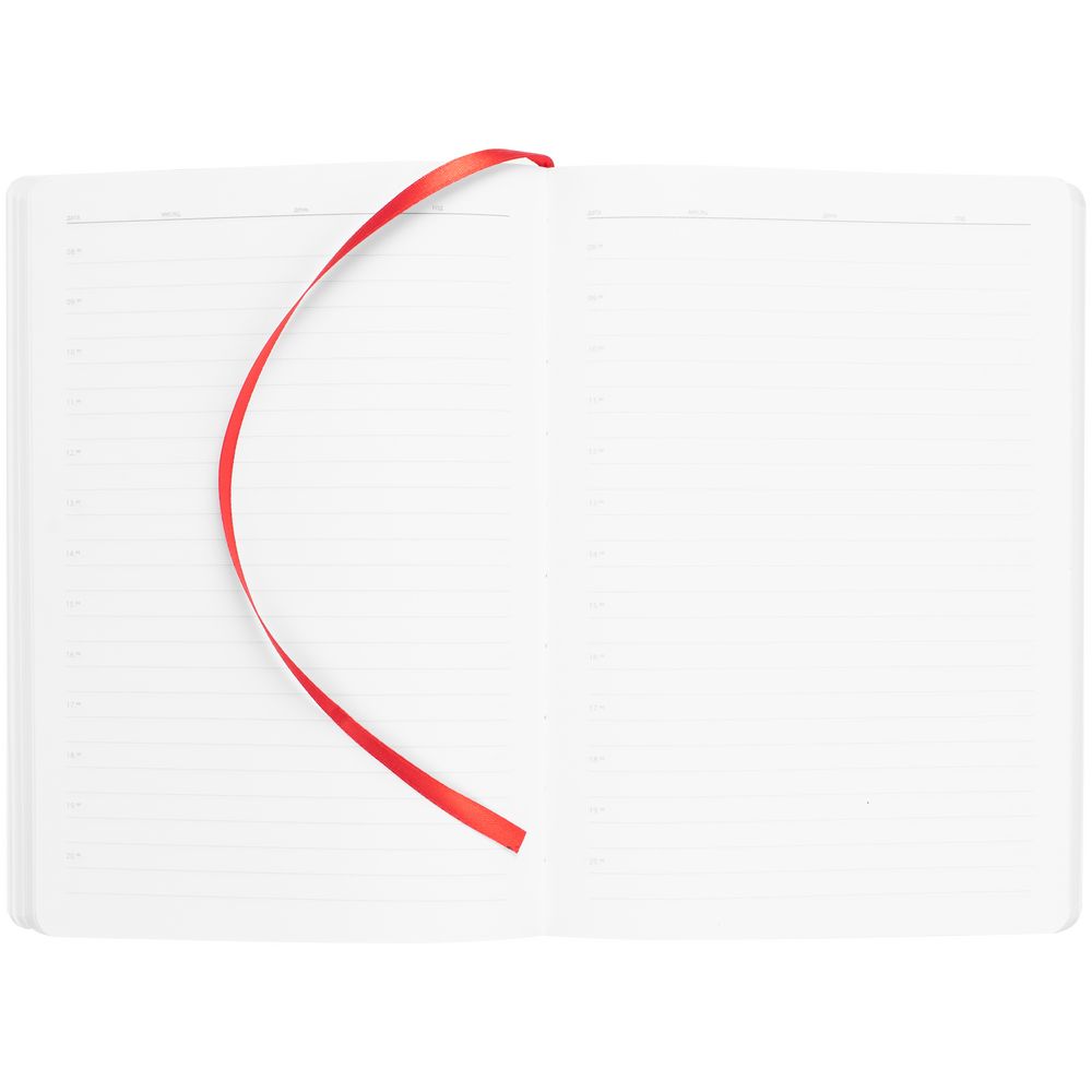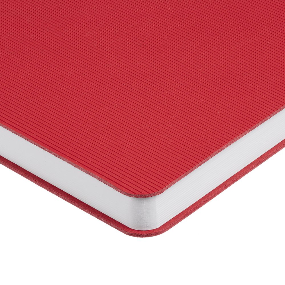 Ежедневник с гибкой обложкой выполнен из материала Soft Touch Ultra, красный РР и Latte, красный (внутренний материал); дополнен ляссе красного цвета и фактурным тиснением обложки.