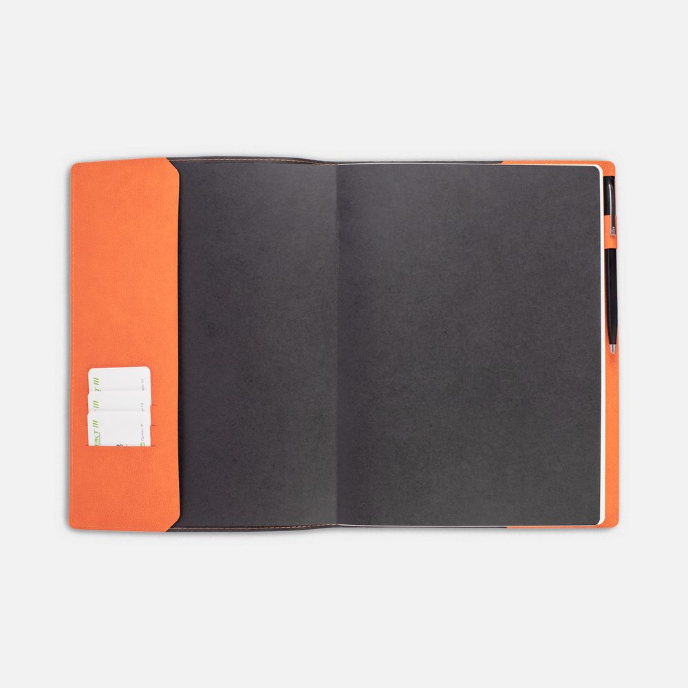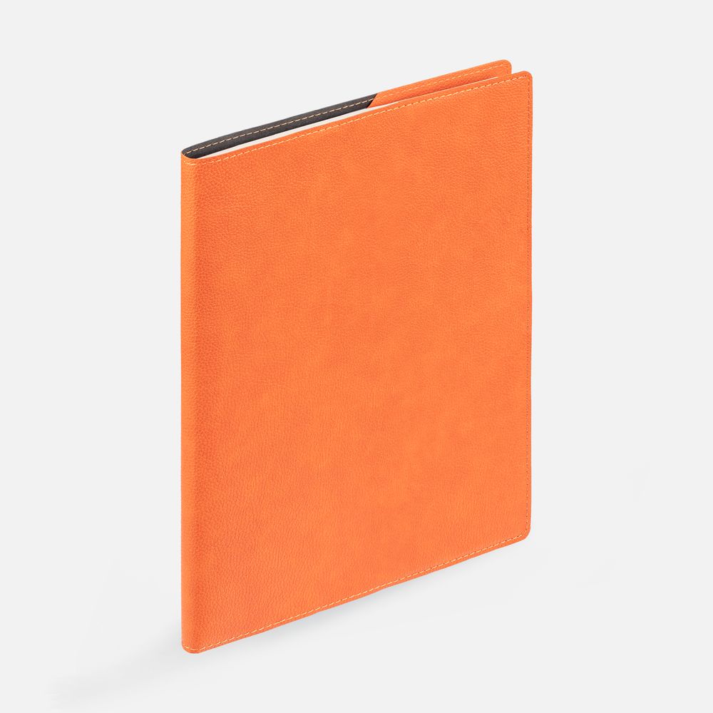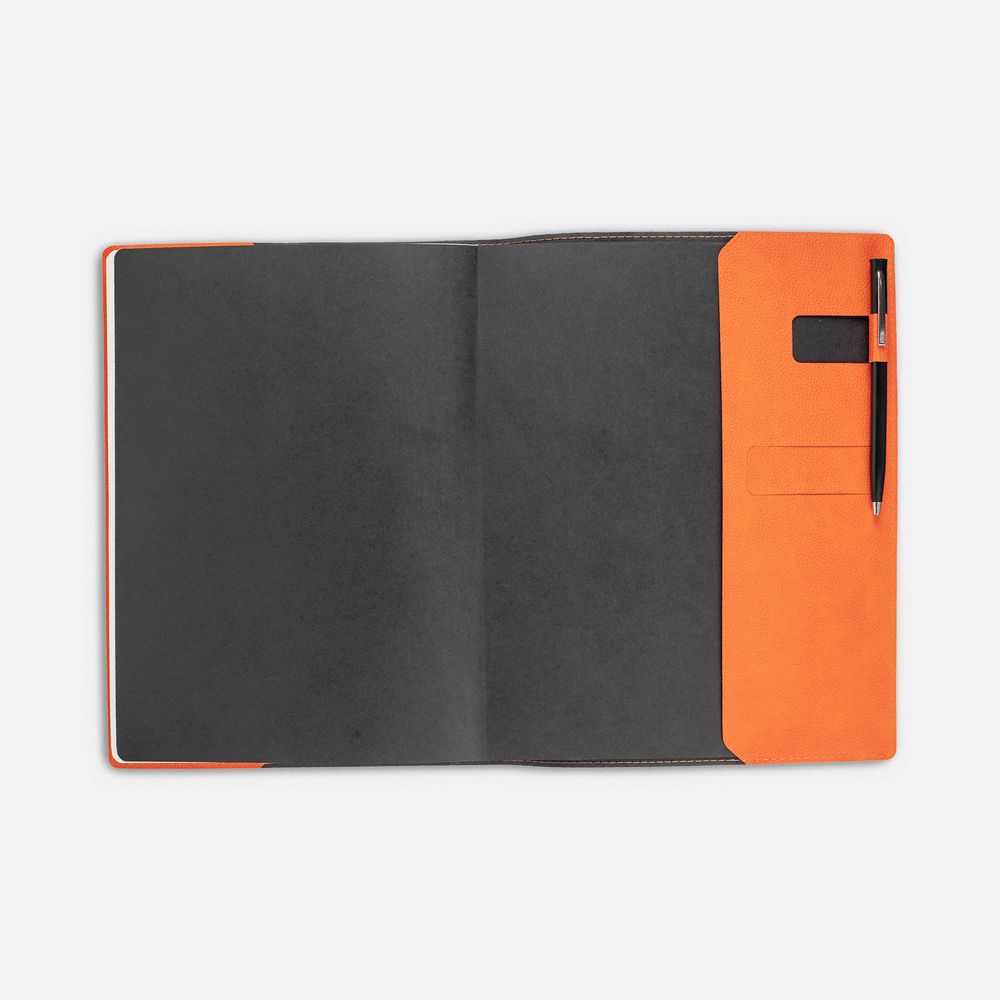 Ежедневник в суперобложке выполнен из материала La Fite, оранжевый ОО, дополнен ляссе и капталом черного цвета.