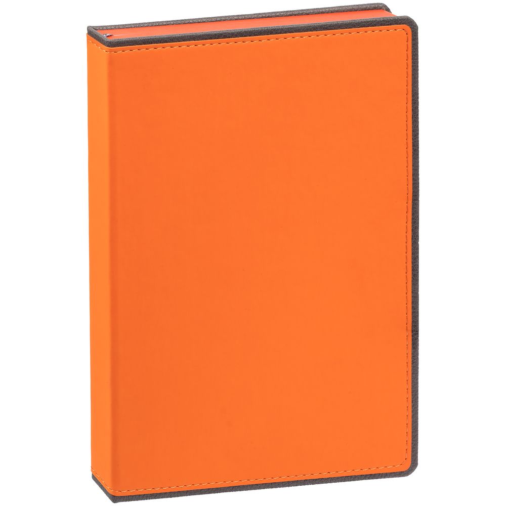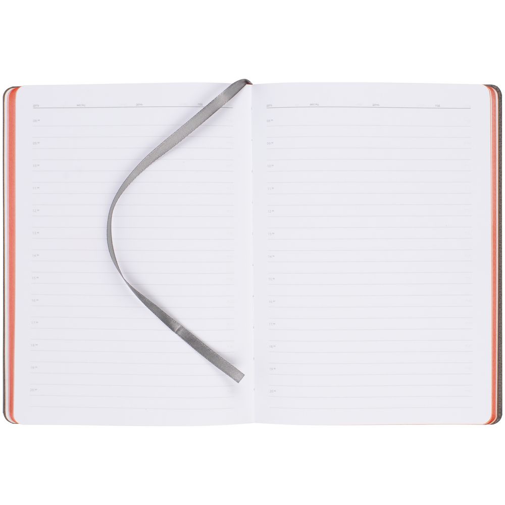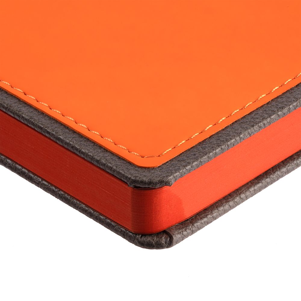 Ежедневник с твердой обложкой, выполнен из материалов Soft Touch, оранжевый ОО и La Fite, серый СС. Ляссе темно-серого цвета.