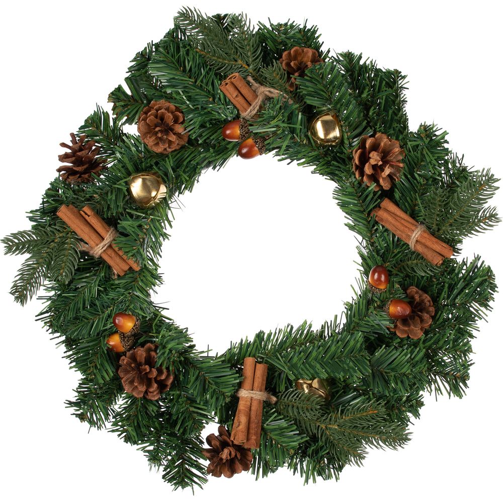 Также рождественский венок — это символ гостеприимства и возможность поделиться праздничным настроением с самыми близкими и важными людьми в году!Венок украшен шишками, желудями, палочками корицы и золотистыми бубенчиками.