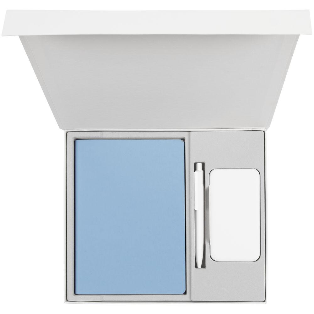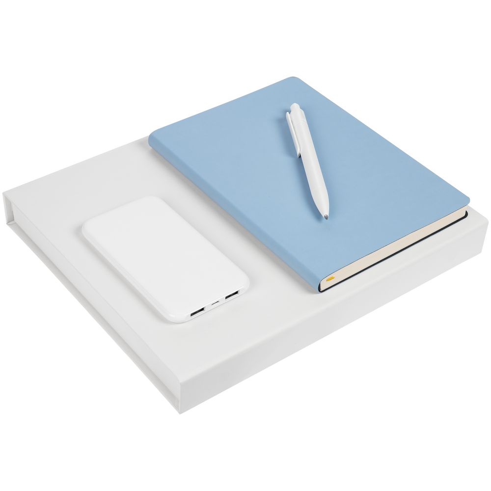 ежедневник - искусственная кожа; ручка - пластик; внешний аккумулятор - покрытие софт-тач, пластик; коробка - переплетный картон, покрытие софт-тач