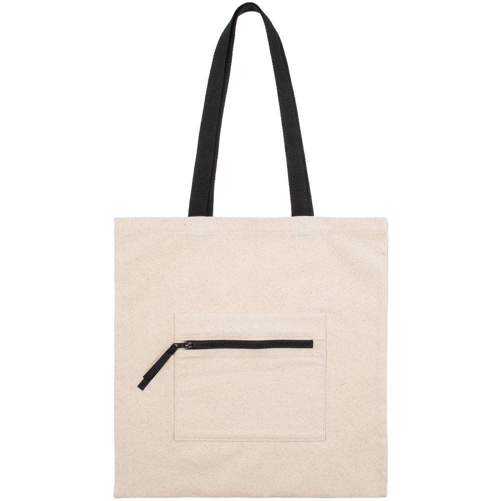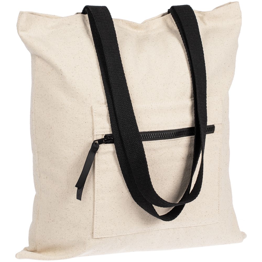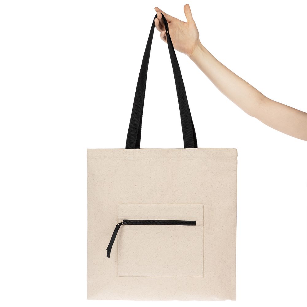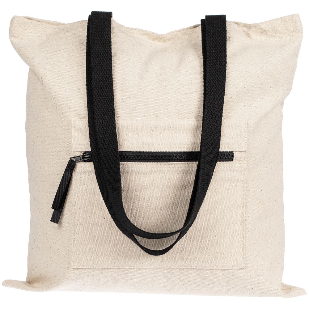 Шопер из плотного неокрашенного хлопка с наружным карманом и контрастными деталями — нескучное решение в экостиле.