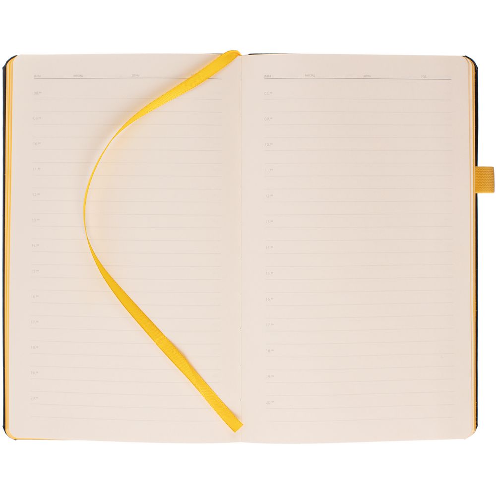 Ежедневник с полутвердой обложкой, выполнен из материала Waltz, черный АА, дополнен желтой резинкой с металлическим шильдом и ляссе.