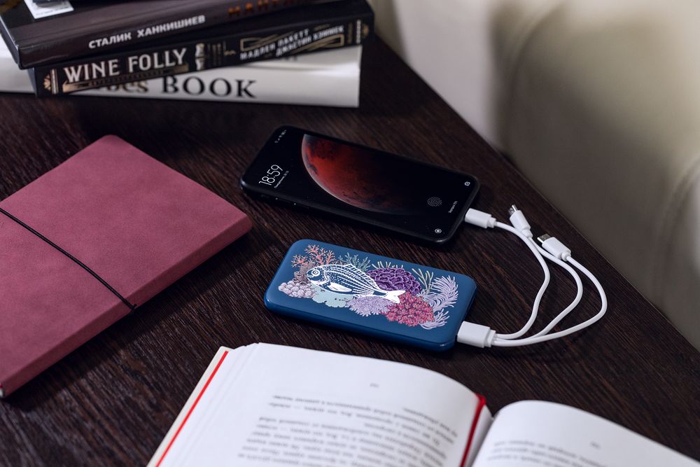 На лицевую поверхность может быть нанесено полноцветное изображение, а гравировка, хотя и будет одноцветной, сопровождается равномерной белой подсветкой. 120 секунд постоянного холодно-белого свечения при начале заряда смартфона, а также при начале и окончании заряда самого аккумулятора (или при нажатии на кнопку).