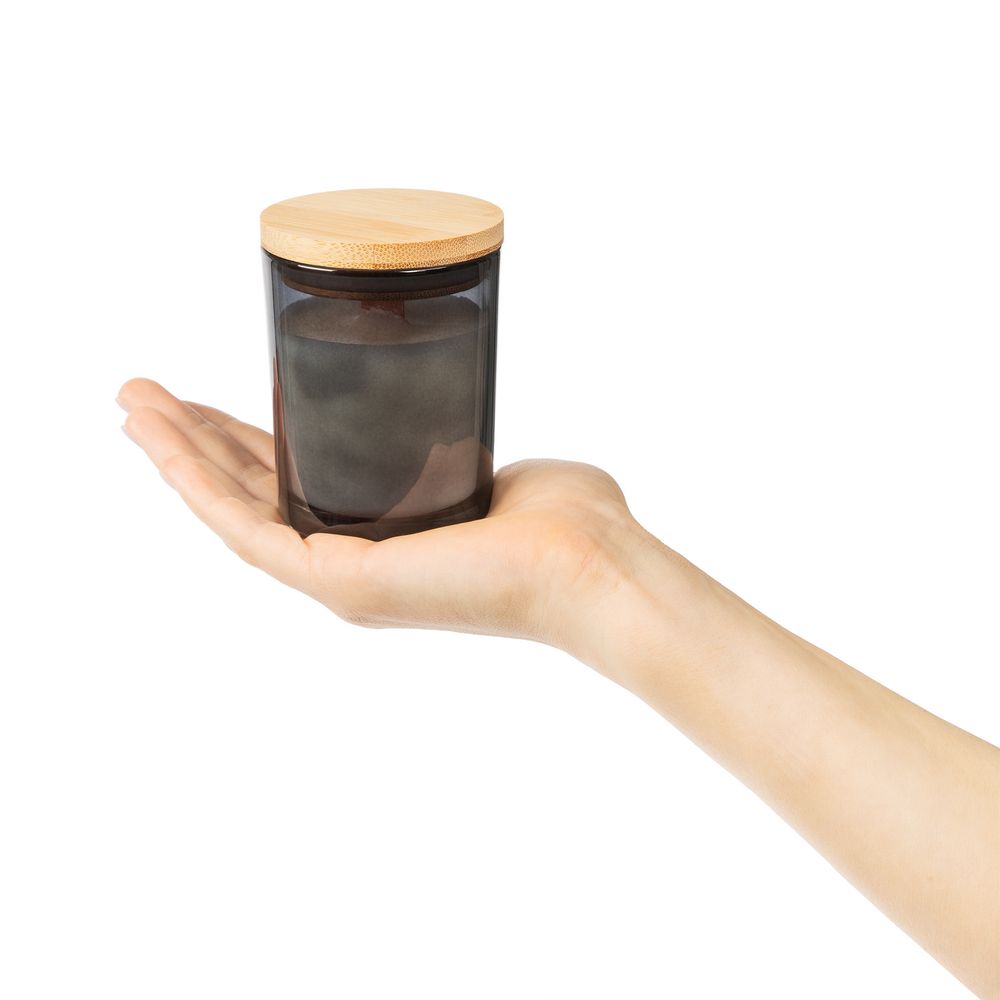 свеча - воск, кокосовый; парафин; подсвечник - стекло; крышка - дерево; фитиль - дерево