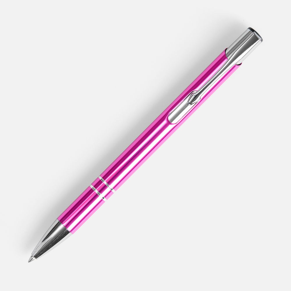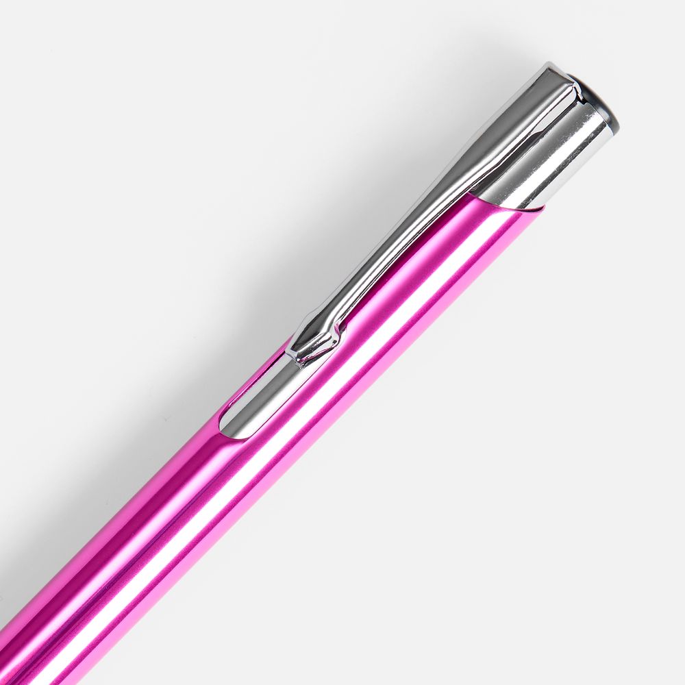 Яркая шариковая ручка с глянцевым цветным корпусом и хромированными деталями.