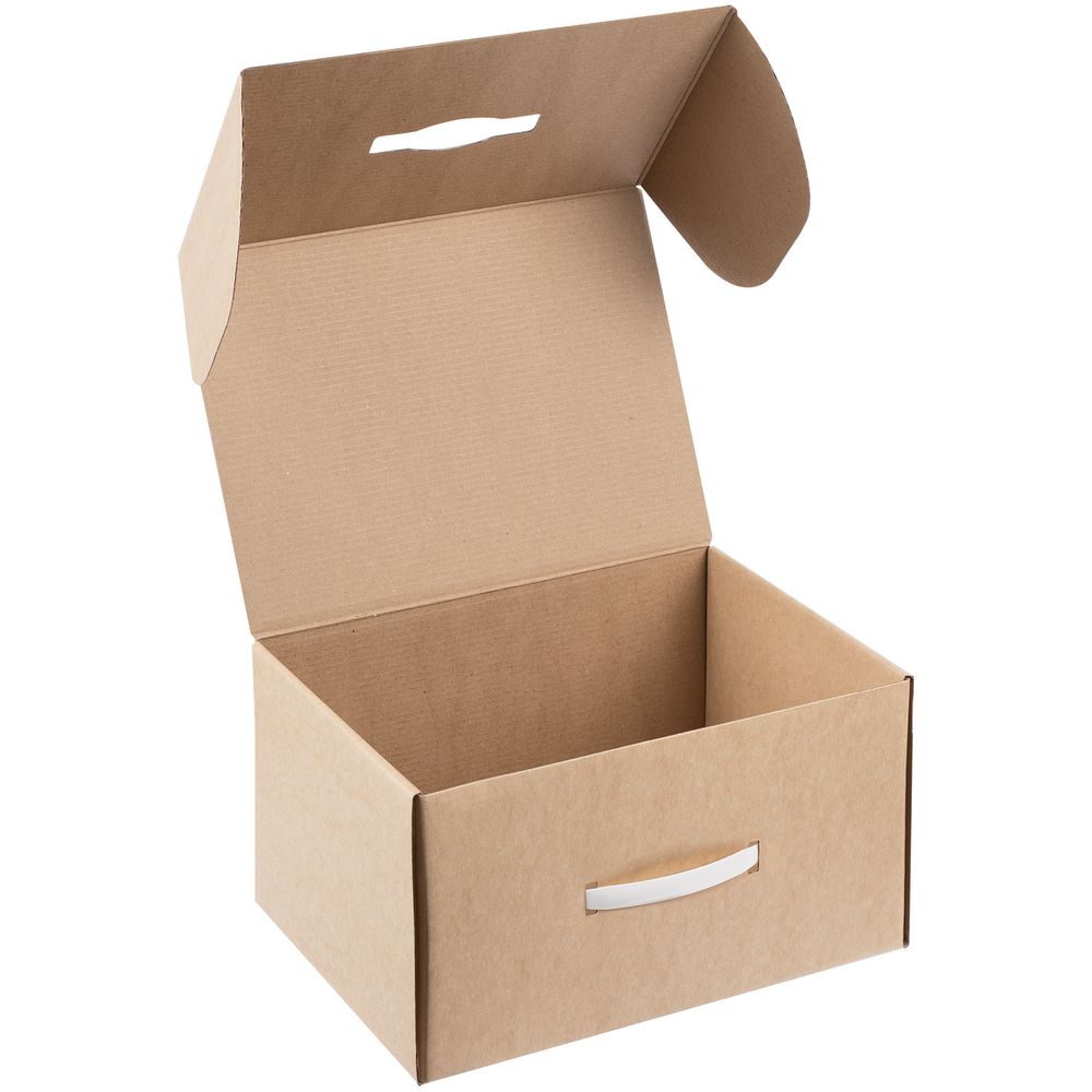 Самосборная коробка-шкатулка со вставной пластиковой ручкой.