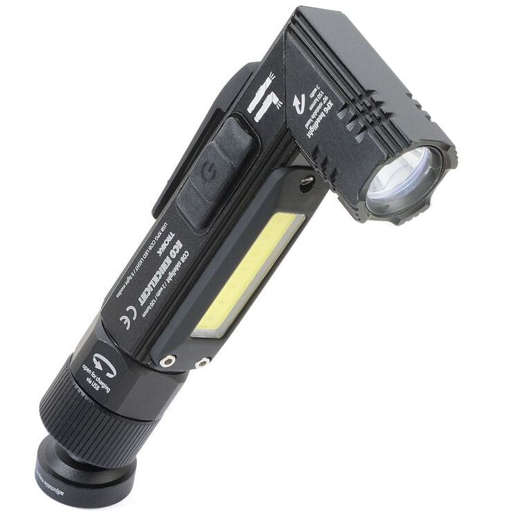 Светодиод COB-LED сбоку работает как фонарь-факел и обеспечивает световой поток яркостью до 200 лм. Это может быть белый свет для работы, либо красный или красный моргающий свет для предупреждения.