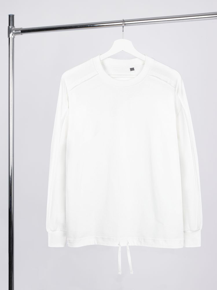Свитшот унисекс оригинального пошива вдохнет новую жизнь в повседневный гардероб и добавит стильную нотку легкой небрежности в образ. Особая конструкция, где часть деталей — плечи и рукава — вывернута наизнанку, создает необычный притягательный эффект.