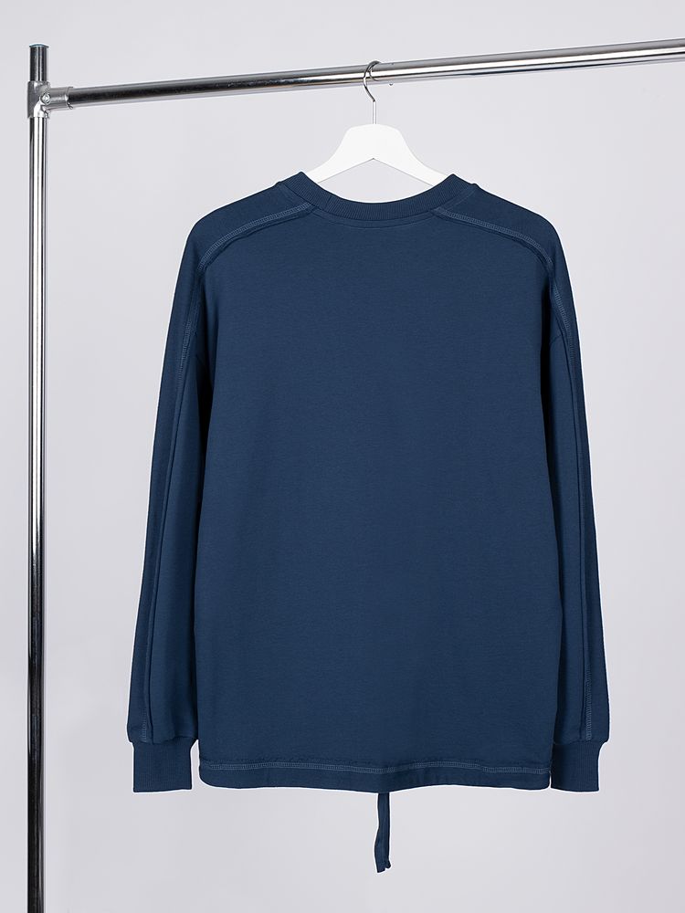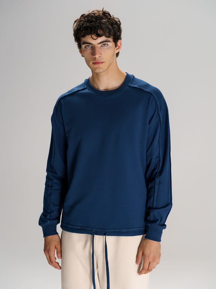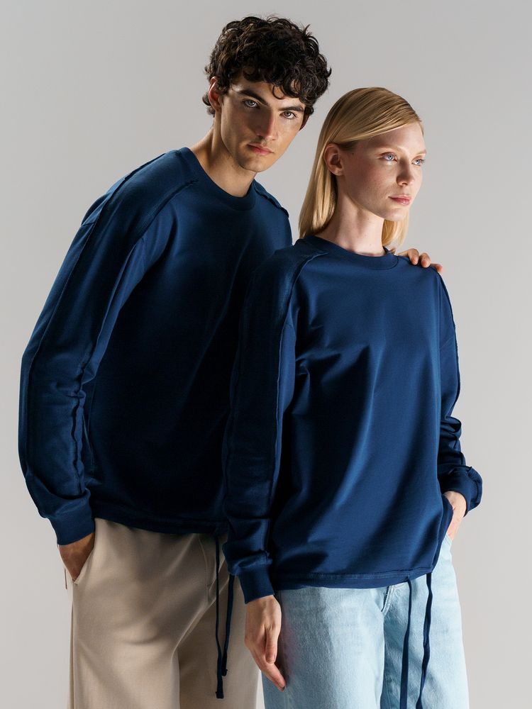 Свитшот унисекс оригинального пошива вдохнет новую жизнь в повседневный гардероб и добавит стильную нотку легкой небрежности в образ. Особая конструкция, где часть деталей — плечи и рукава — вывернута наизнанку, создает необычный притягательный эффект.