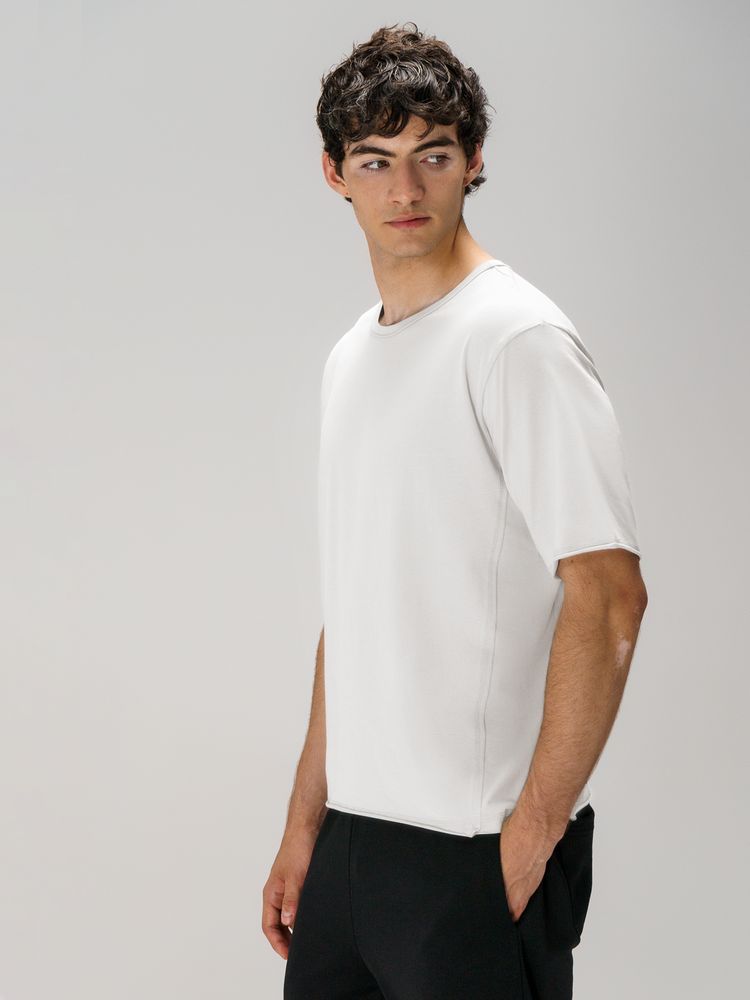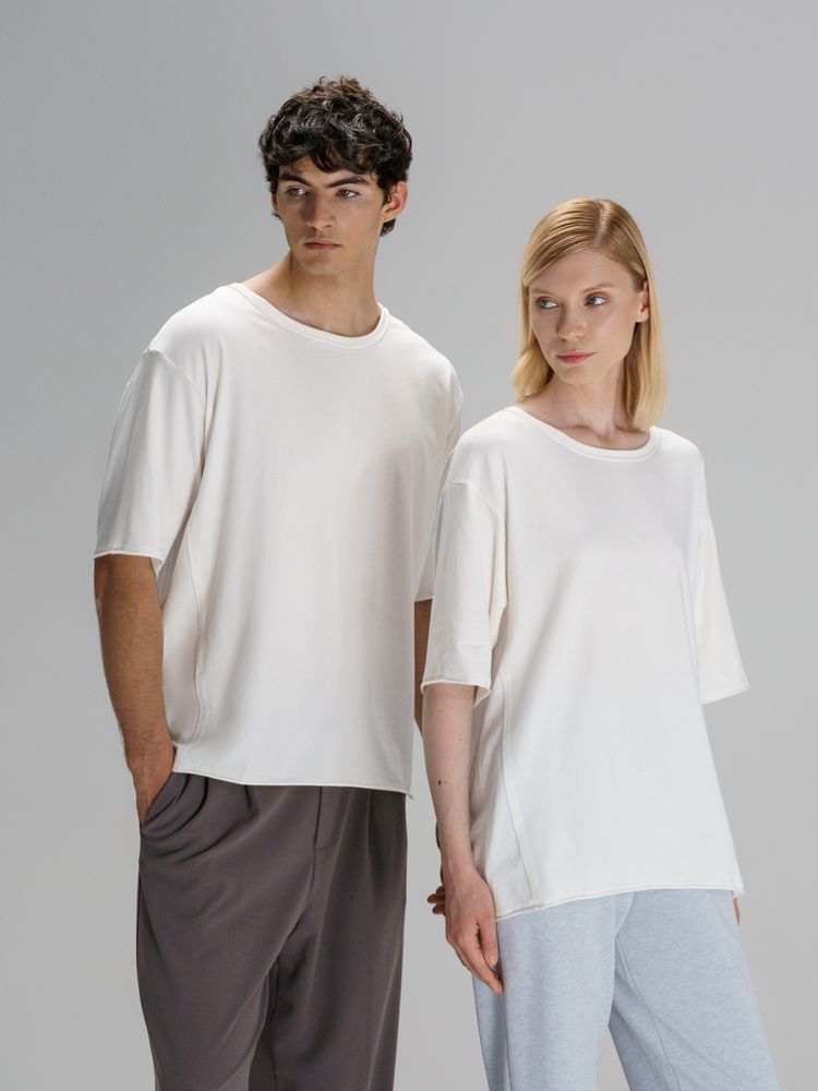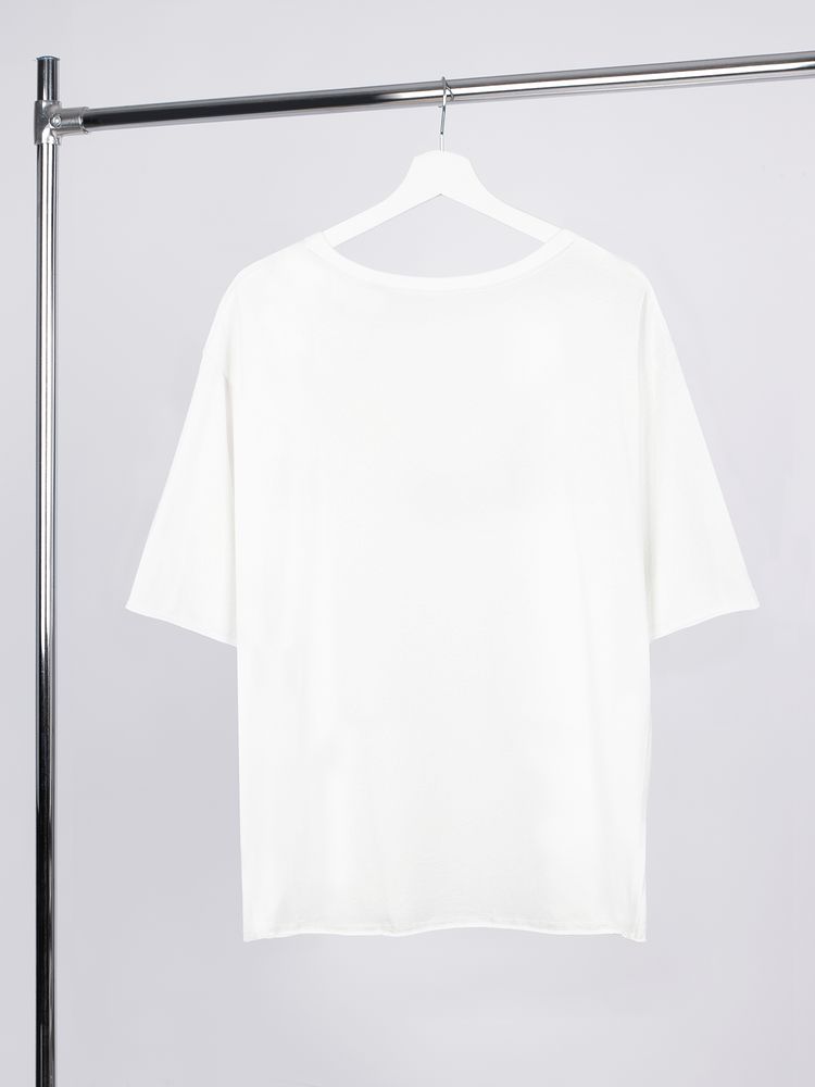 Футболка унисекс свободной посадки Vozduh создана для тех, кто следит за трендами и ценит комфорт. Необработанные края рукавов и низа изделия добавляют ему оригинальности и легкой небрежности, а боковые вставки создают притягательный летящий силуэт.
