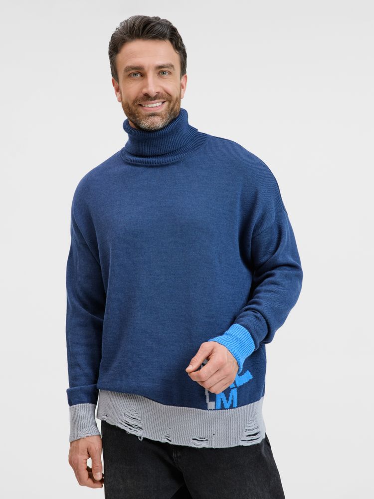 Модель: однотонный гладкий свитер унисекс, спущенное плечо. Ворот, манжеты и низ изделия вывязаны резинкой c добавлением эффекта «рваного» края.