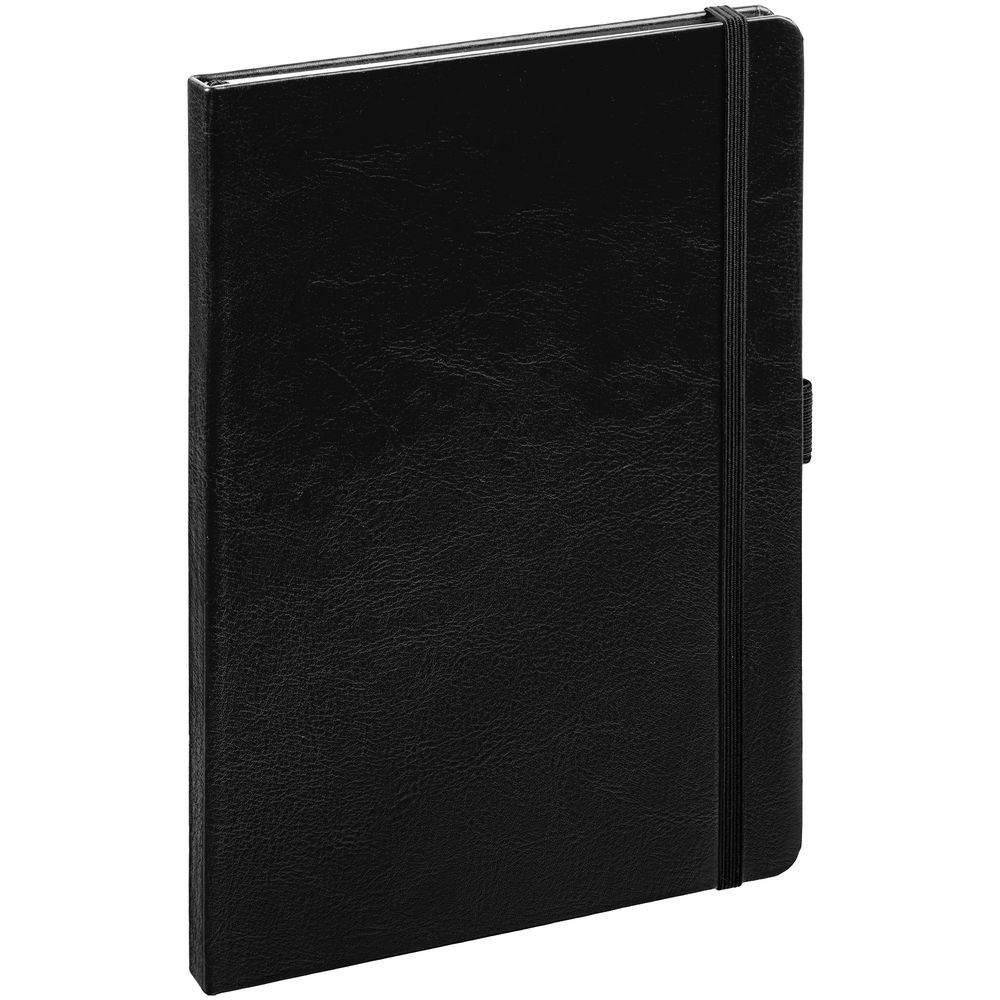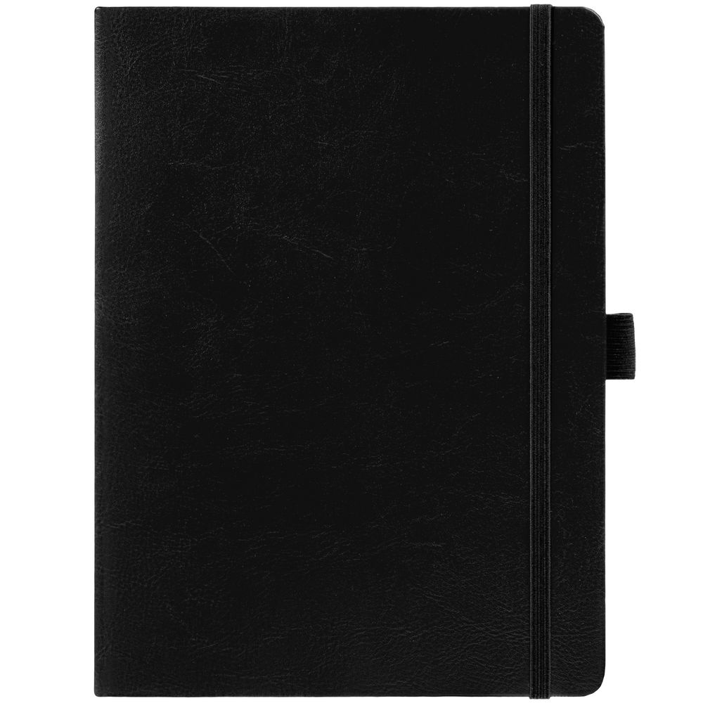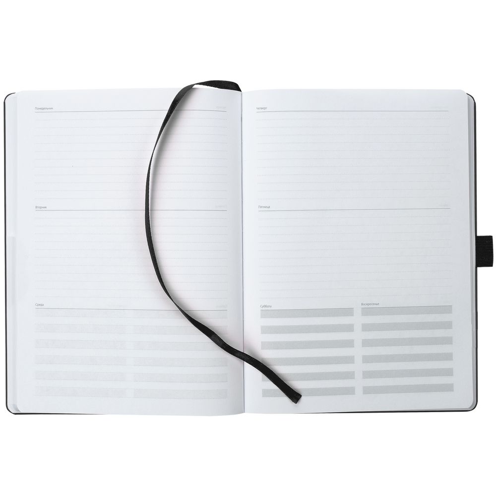 Еженедельник в твердой обложке выполнен из материала Nebraska, черный АА, дополнен резинкой, петлей для ручки и ляссе черного цвета.
