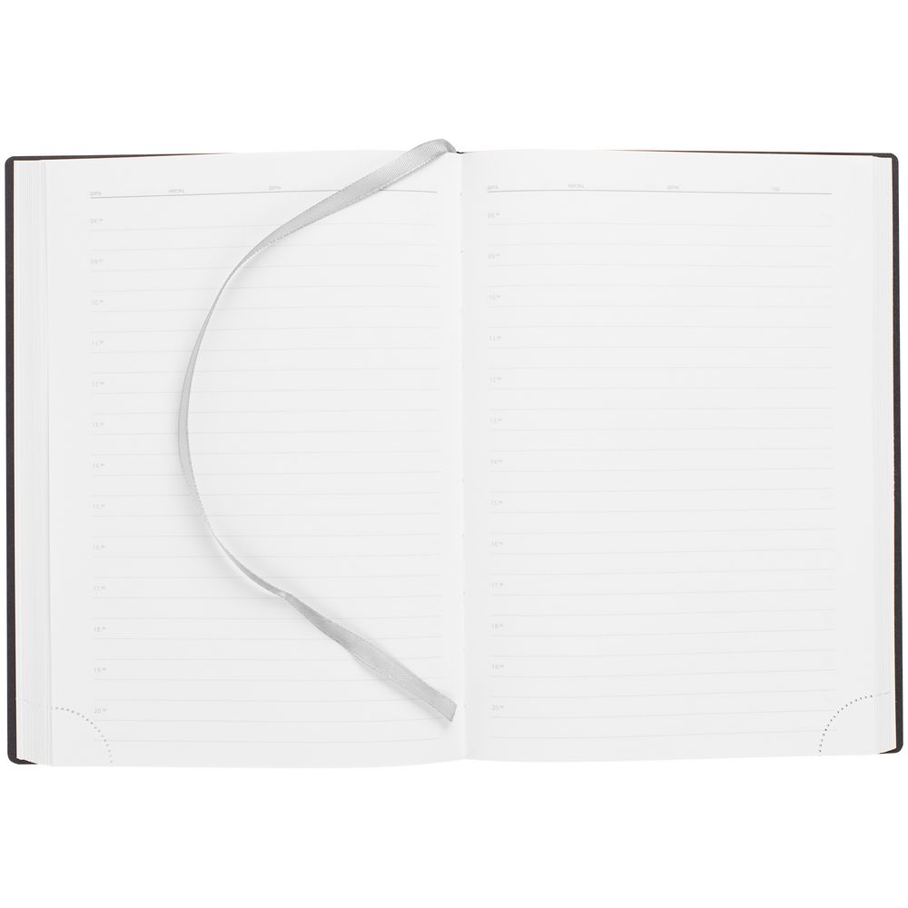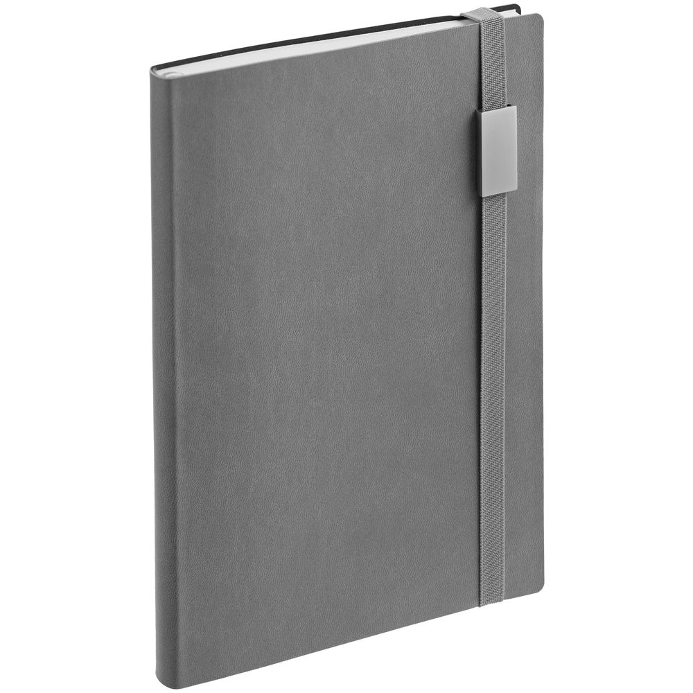 Ежедневник с гибкой обложкой, выполнен из материала Latte, серый CC, дополнен резинкой шириной 1 см с металлическим шильдом, капталом и ляссе серого цвета.