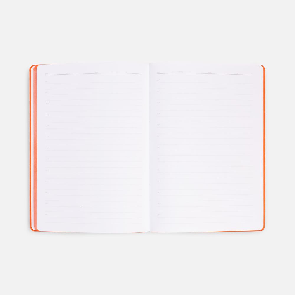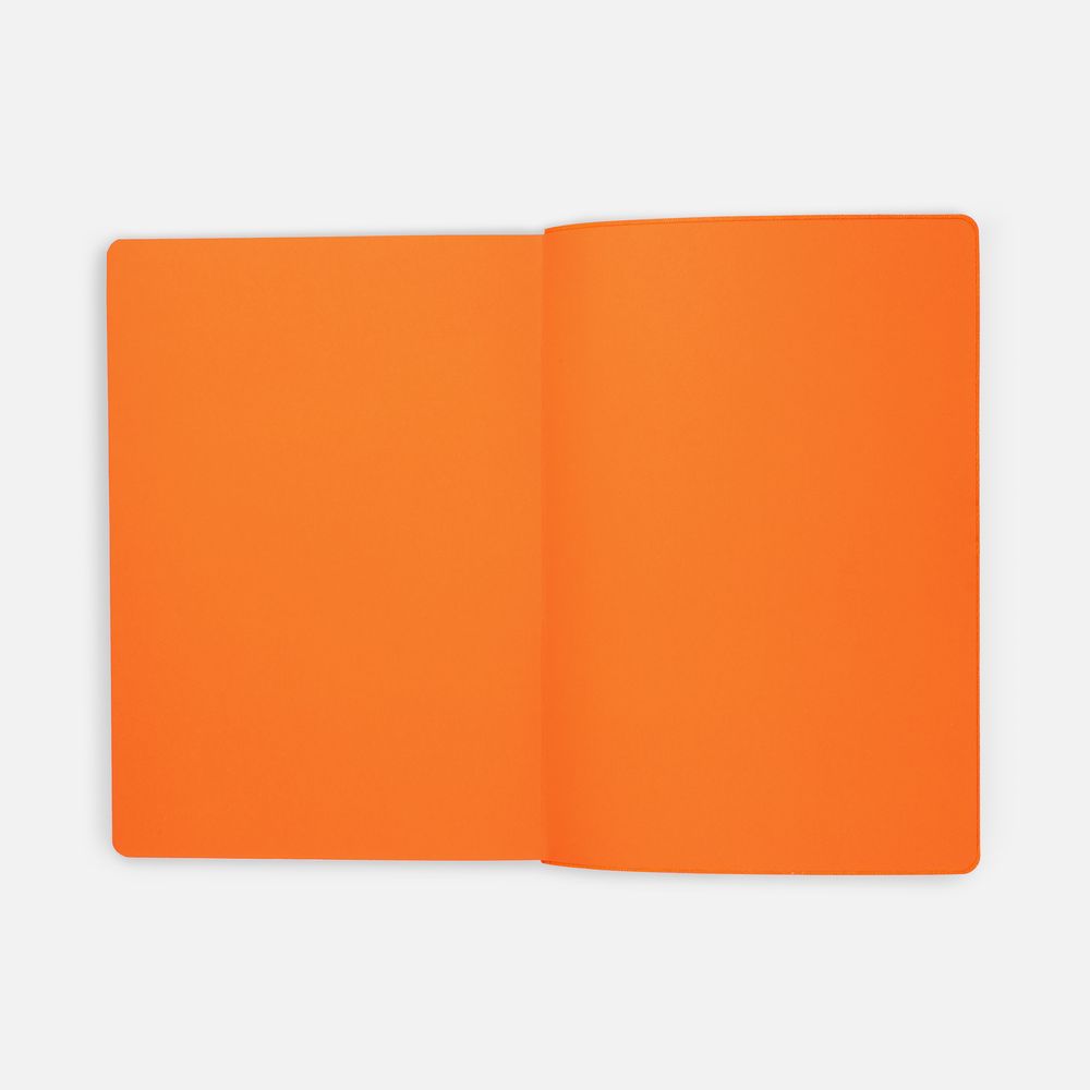 Гибкая обложка выполнена из материала Soft Touch, оранжевый OO и Latte, оранжевый OO (внутренняя часть обложки). Внутри корешка — специальное место для крепления ручки размером до 15х1 см.