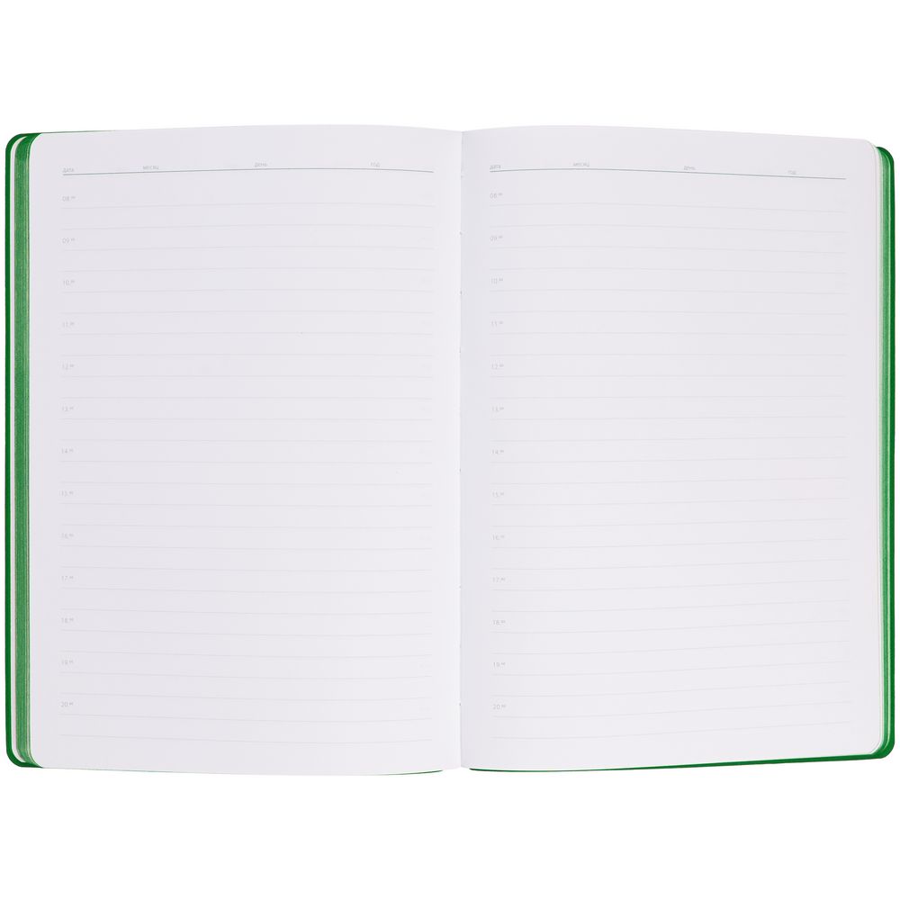 Гибкая обложка выполнена из материала Soft Touch Ultra, зеленый FF и Latte, зеленый FF (внутренняя часть обложки). Внутри корешка — специальное место для крепления ручки размером до 15х1 см.