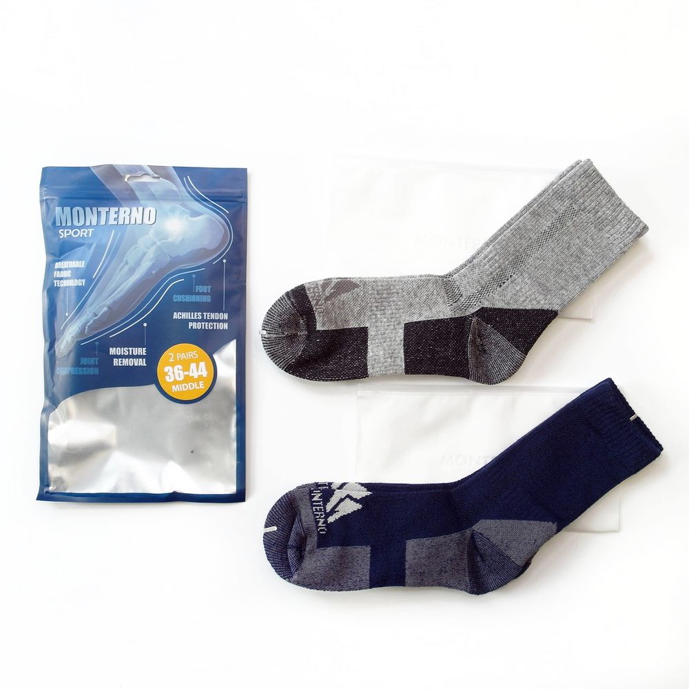 Monterno Sport имеют специальные утолщения для дополнительной амортизации и защиты от ударов и натираний. Плоские швы не натирают ноги, усиленные зоны в районе пятки и пальцев повышают износостойкость.
